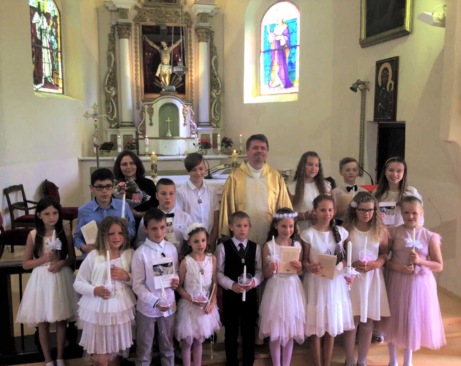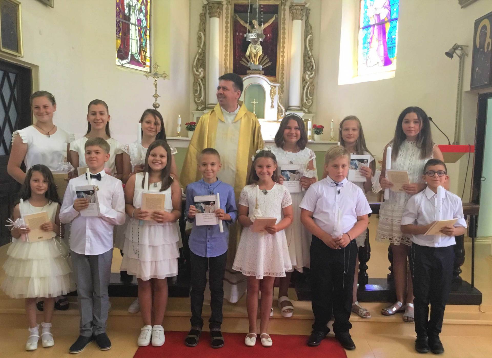 Šiais metais mūsų parapijoje Šventąją Komuniją pirmą kartą priėmė 28 vaikai. Po Mišių klebonas kun. G. Pūras vaikams įteikė pažymėjimus ir dovanojo popiežiaus Pranciškaus knygą “Pergalingos meilės šventimas”. Dvasininkas padėkojo giesmininkams, katechetei bei visiems prisidėjusiems prie šventės organizavimo. Klebonas kun. G. Pūras linkėdamas gražios šventės šeimose, vylėsi, kad tėveliai suvoks poreikį dažniau dalyvauti šv. Mišiose kartu su vaikais. Knygoje „Pergalingos meilės šventimas: trečiadienio katechezės apie Mišias popiežius Pranciškus primena, kad „Eucharistija yra nuostabus įvykis, kuriame pasirodo esantis Jėzus Kristus, mūsų gyvybė”.