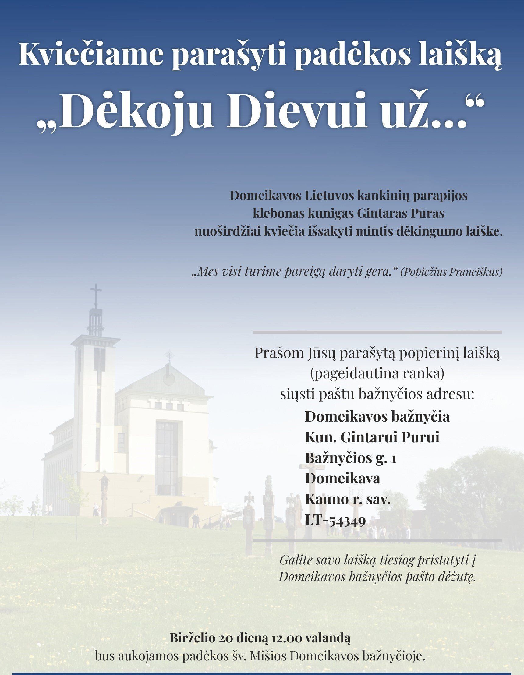 Nuoširdžiai prašome iki birželio 19 dienos paruoštą laišką tiesiog pristatyti į Domeikavos bažnyčios pašto dėžutę