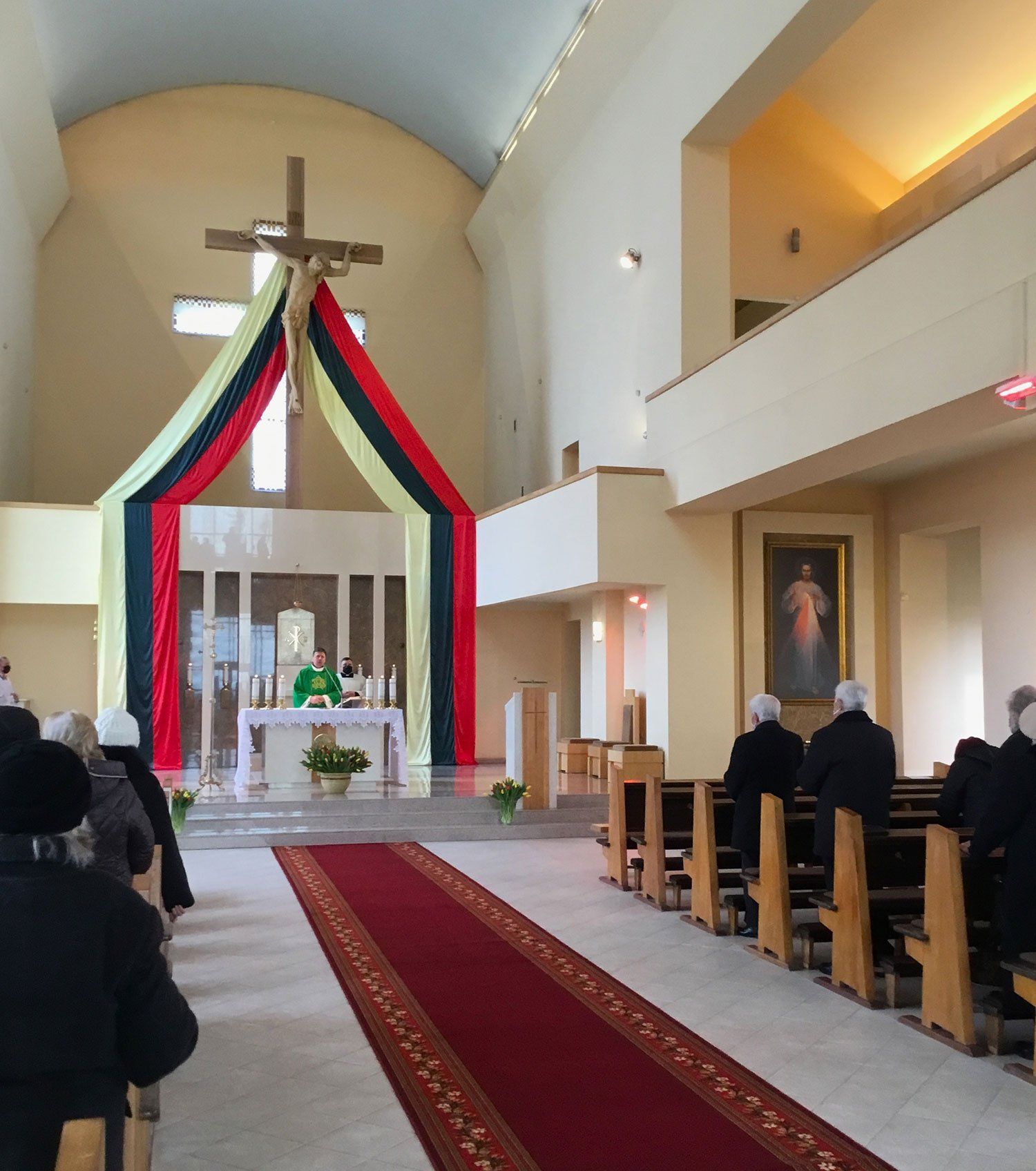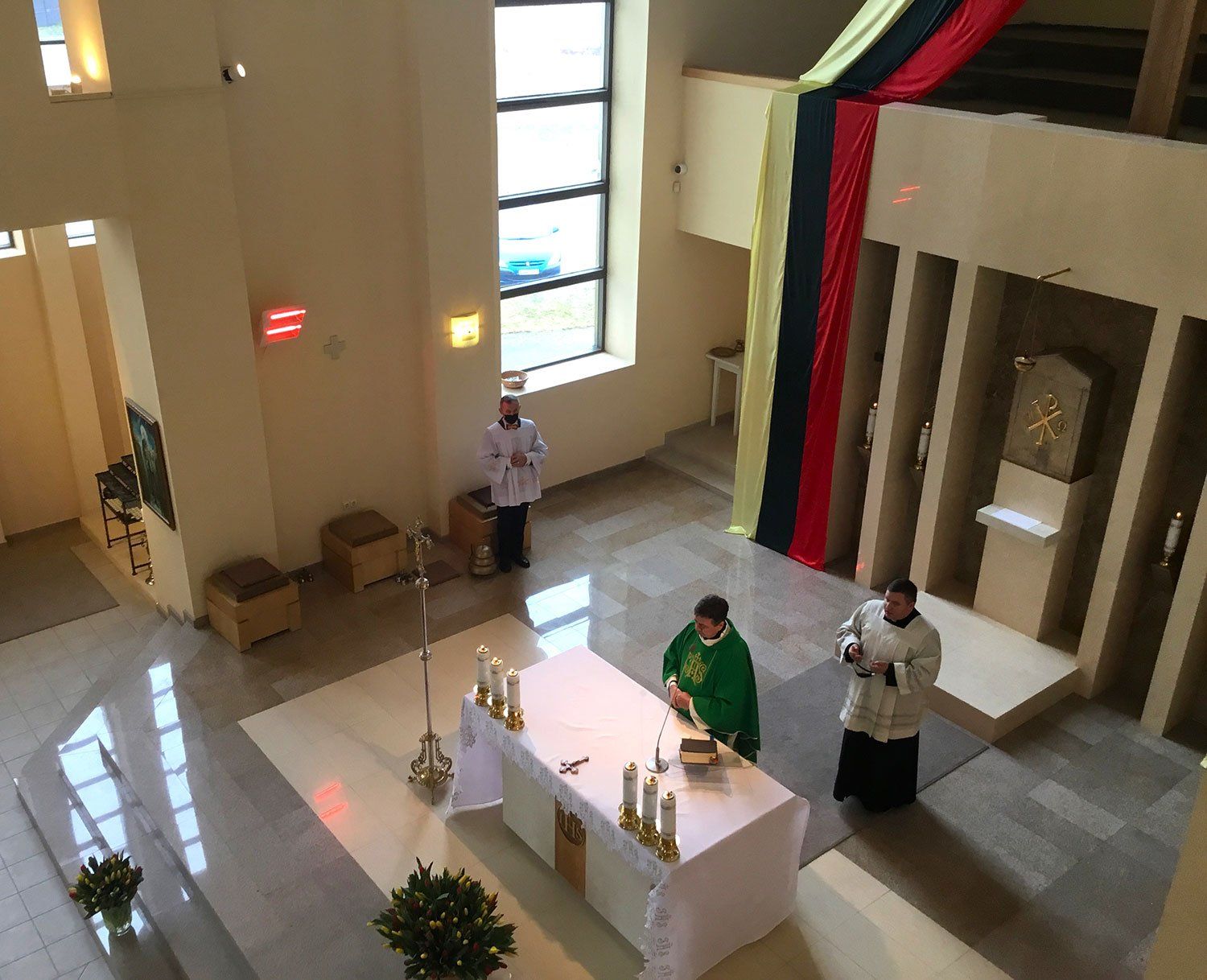 Po šv. Mišių maldos namuose visi kartu giedojome Lietuvos valstybės himną – Vinco Kudirkos „Tautišką giesmę“.