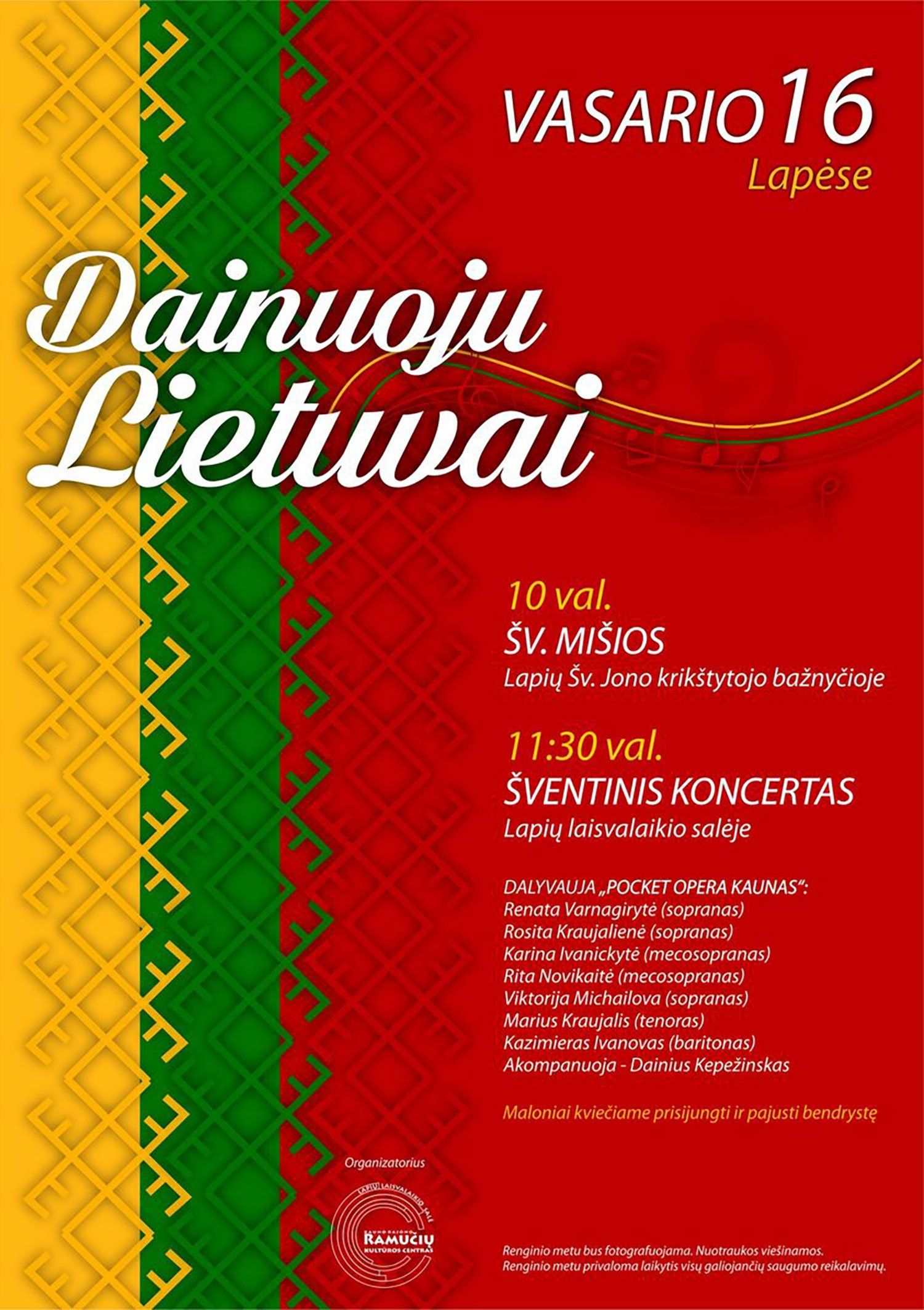 Vėliau Lapių miestelio kultūros namuose vyko koncertas „Dainuoju Lietuvai”, skirtas Lietuvos Valstybės atkūrimo dienai paminėti. Gerą nuotaiką žiūrovams dovanojo Domeikavos laisvalaikio salės folkloro kolektyvas „Džiaukis” ir „Pocket Opera Kaunas” jaunieji operos dainininkai ir muzikai.