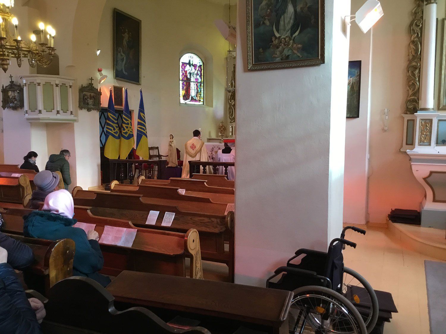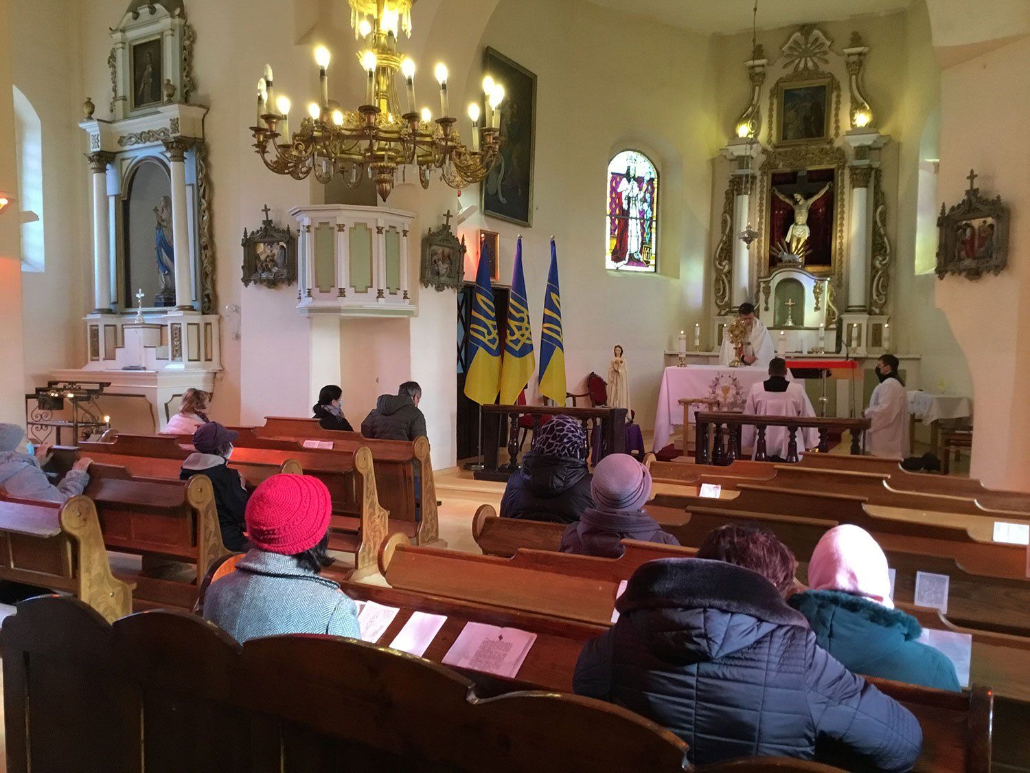Po pamaldų klebonas kun. G. Pūras atsiklaupęs prie Dievo Motinos statulos, perskaitė Ukrainos ir Rusijos paaukojimo Nekalčiausiajai Švč. Marijos Širdžiai aktą kartu su maldininkais bažnyčioje.