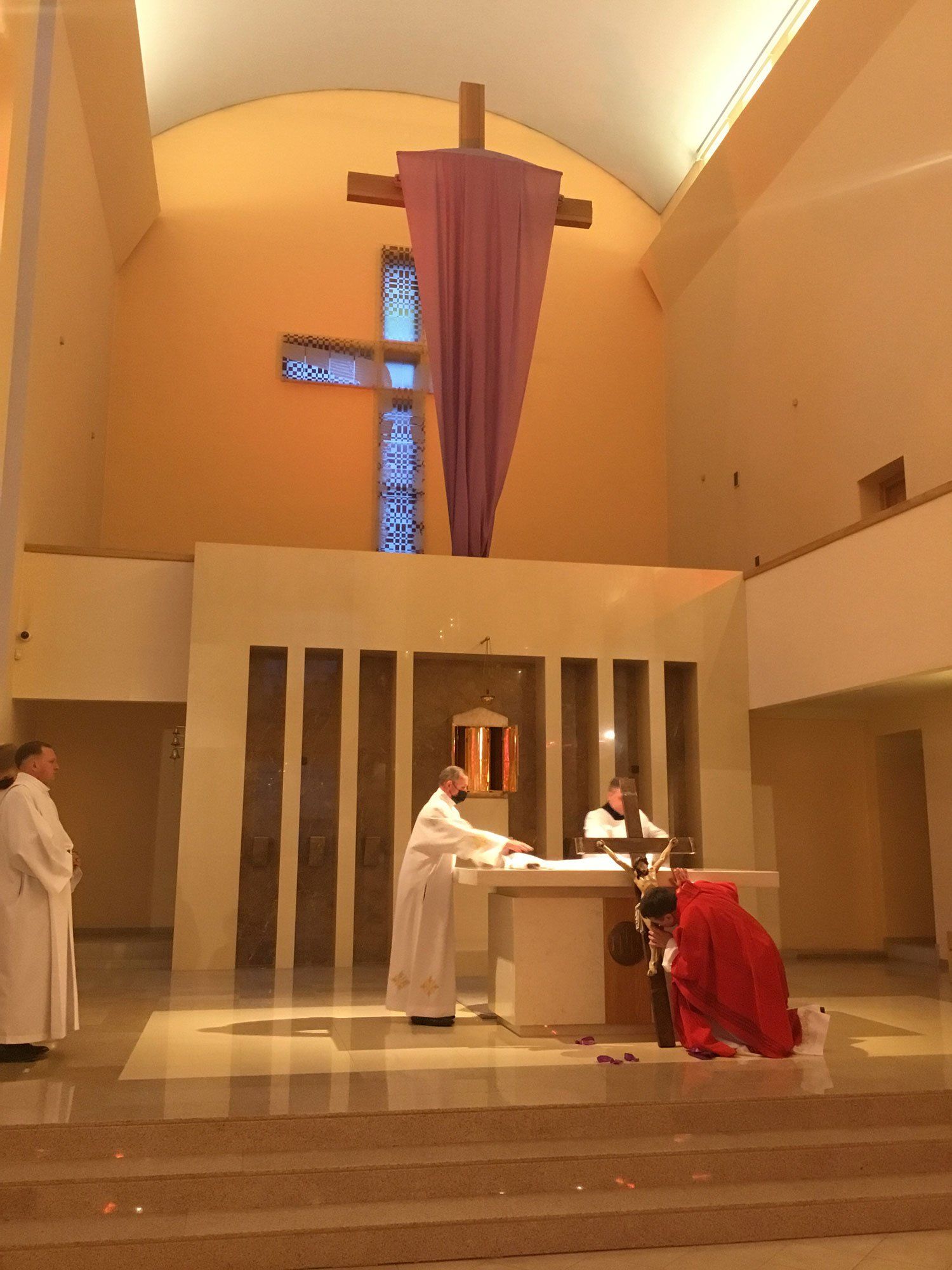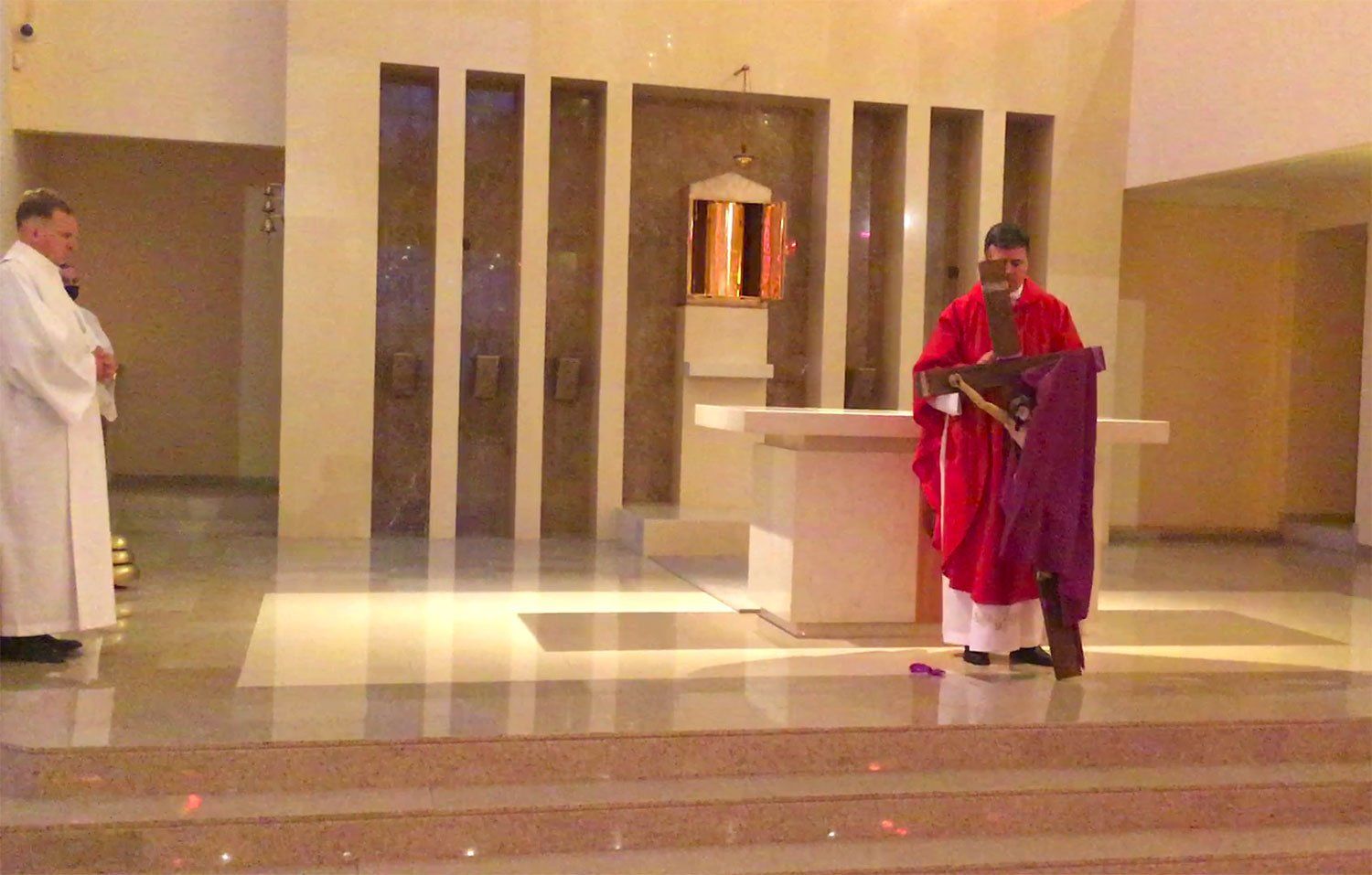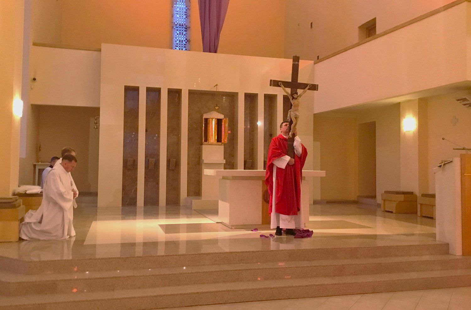 Didįjį penktadienį nėra aukojamos šv. Mišios. Viešpaties Kančios pamaldų pradžioje kunigas parpuolęs priešais altorių kniūbsčias meldžiasi tyloje kartu su tikinčiaisiais. Vėliau buvo skaitoma vaidmenimis Viešpaties Jėzaus Kristaus Kančios istorija. Vėliau dvasininkas tris kartus giedodamas giesmę „Štai kryžiaus medis, ant kurio kabojo pasaulio Atpirkėjas“, nudengė Kristaus kančią ir pabučiavimu pagarbino kryžių. Pamaldų dalyviai pagarbino kryžių nusilenkdami. Už kryžiaus pagarbinimą buvo galima gauti visuotinius atlaidus.