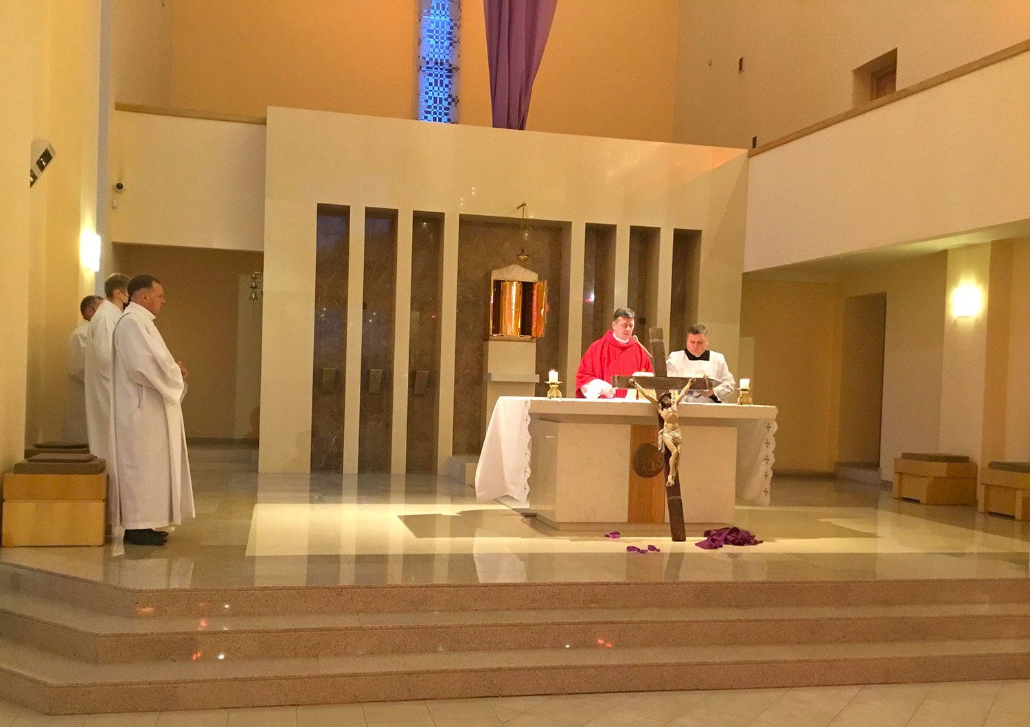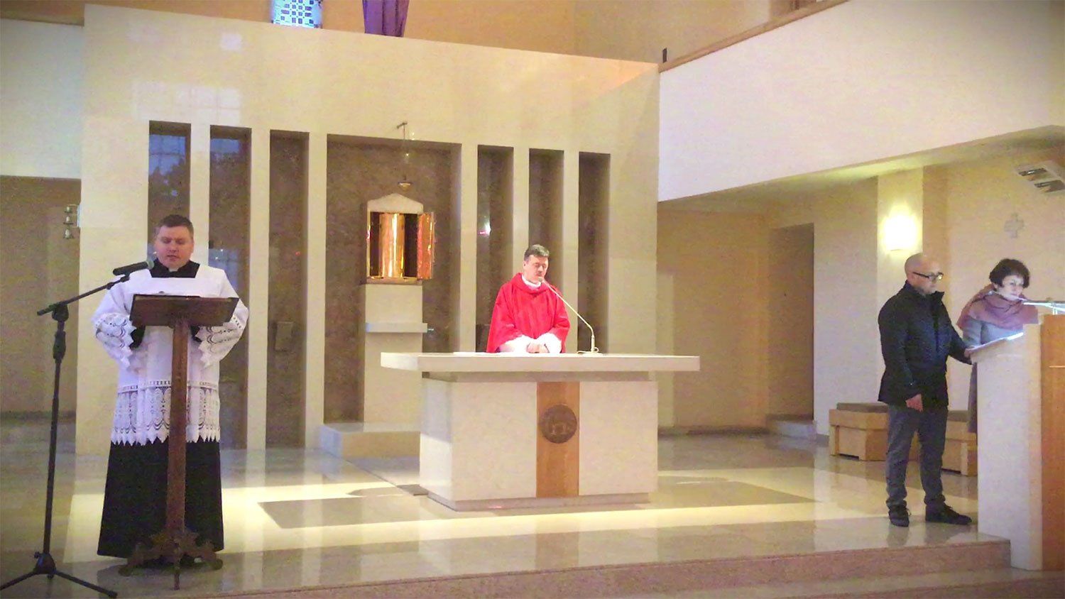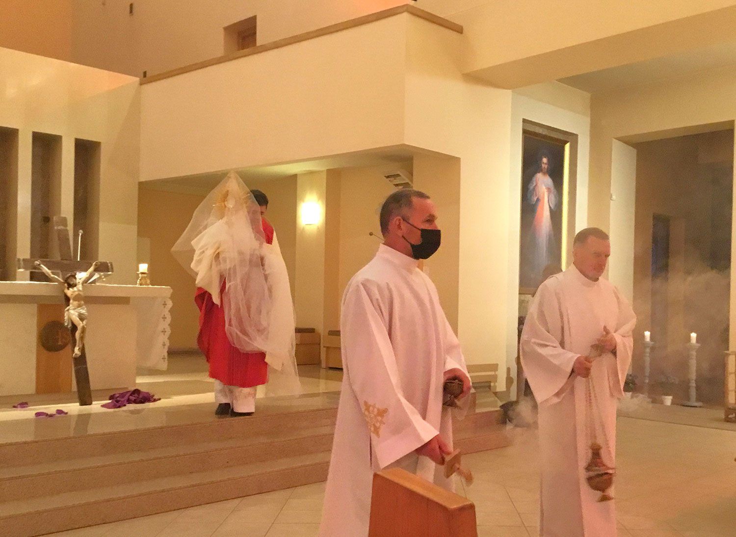 Didžiojo Velykų Tridienio liturgijai Domeikavos Lietuvos kankinių bažnyčioje vadovavo parapijos klebonas kun. Gintaras Pūras, jam talkino klierikas Mantas Šideikis. Didžiąją Velykų savaitę Bažnyčia ypač švenčia tris dienas; Didijį ketvirtadienį, Didijį penktadienį ir Didijį šeštadienį (Velyknaktį). Velykų tridienis pasiekia kulminaciją Velykų vakarą Šventosios nakties – Velyknakčio budėjimu.