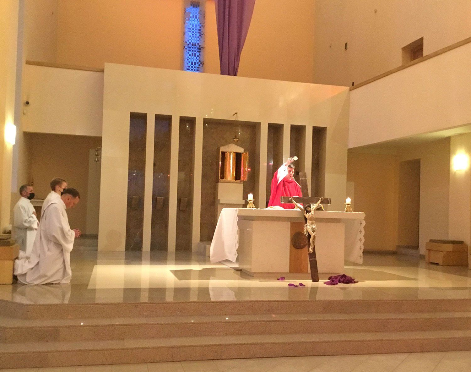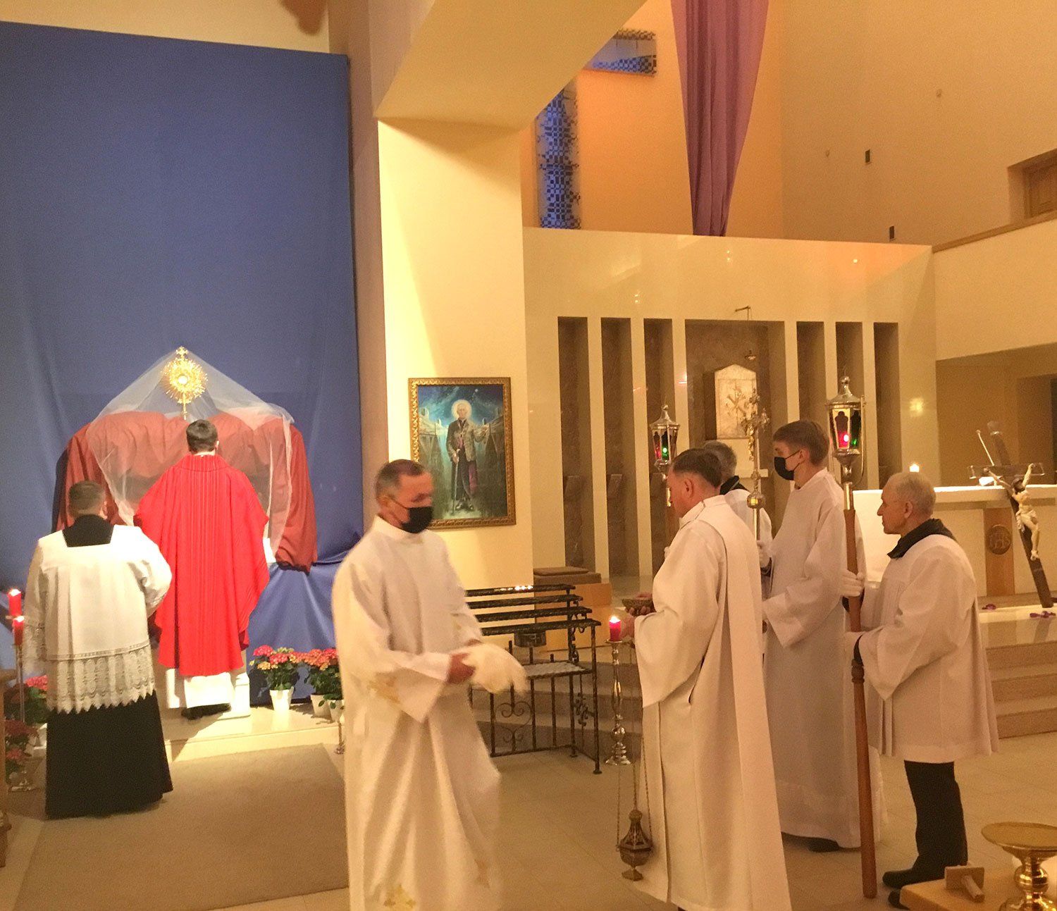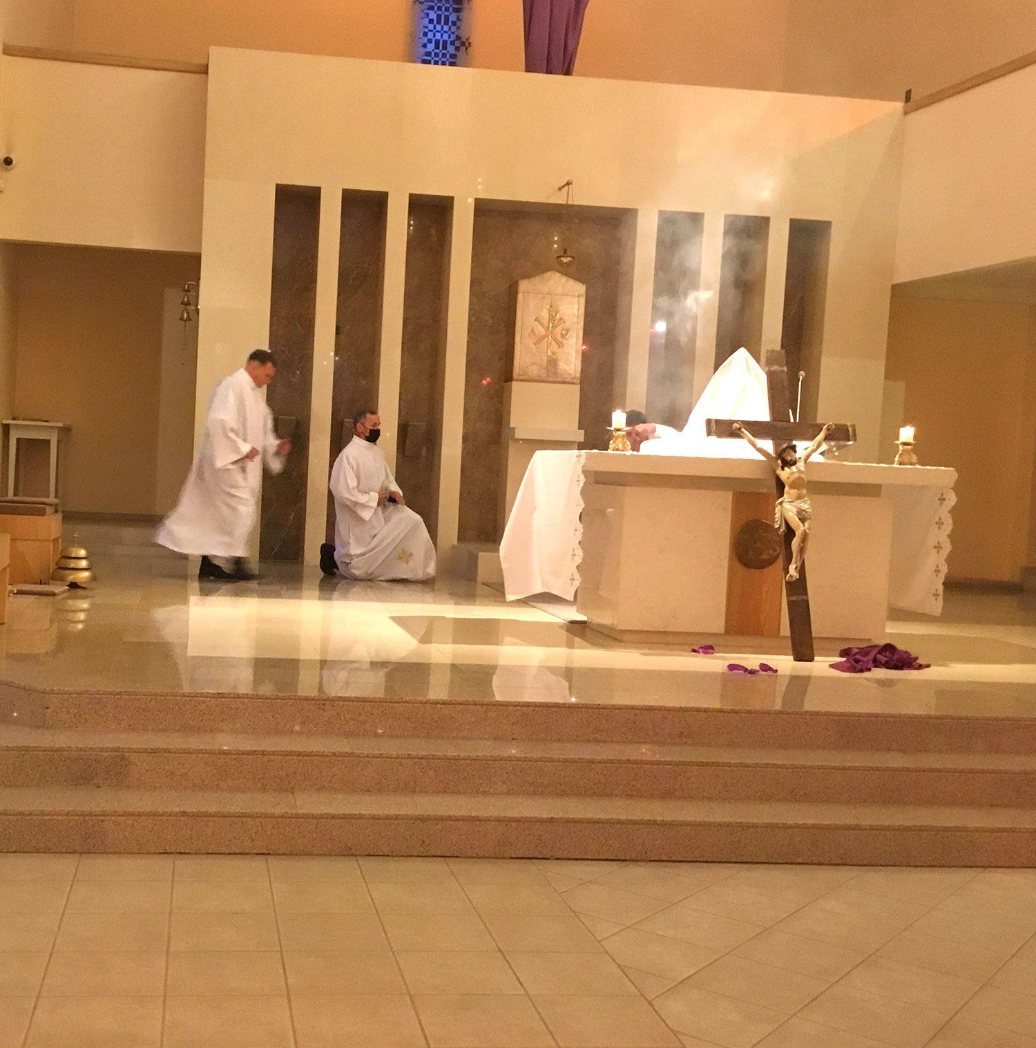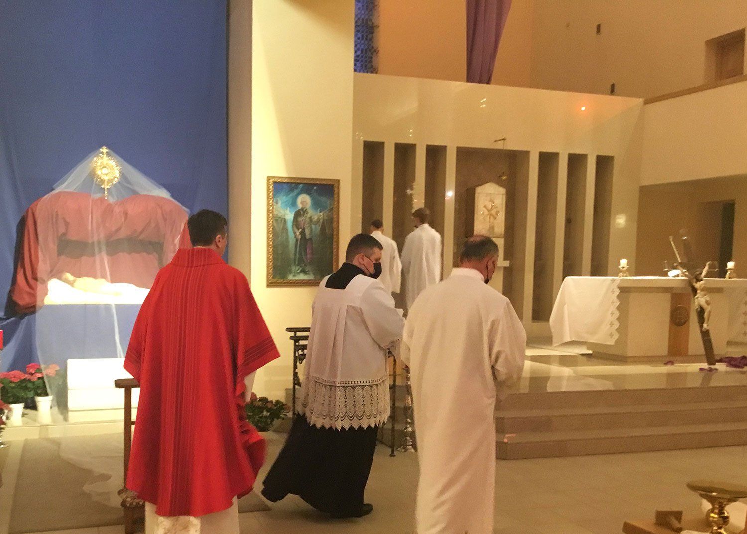 Didžiojo Velykų Tridienio liturgijai Domeikavos Lietuvos kankinių bažnyčioje vadovavo parapijos klebonas kun. Gintaras Pūras, jam talkino klierikas Mantas Šideikis. Didžiąją Velykų savaitę Bažnyčia ypač švenčia tris dienas; Didijį ketvirtadienį, Didijį penktadienį ir Didijį šeštadienį (Velyknaktį). Velykų tridienis pasiekia kulminaciją Velykų vakarą Šventosios nakties – Velyknakčio budėjimu.
