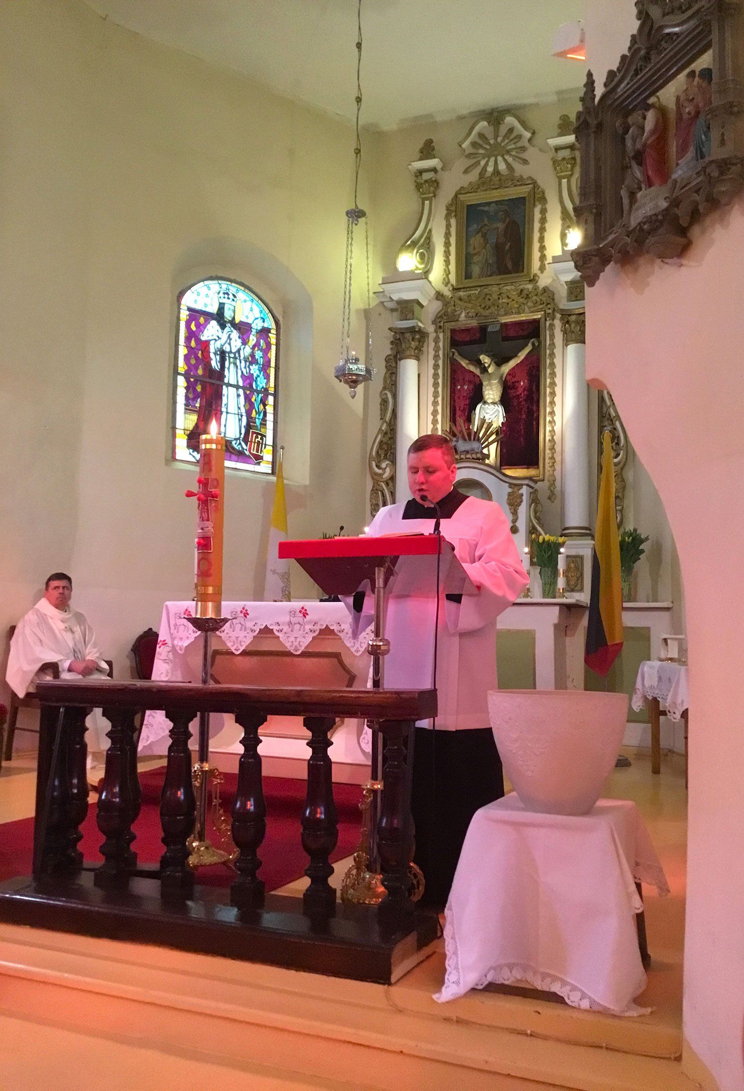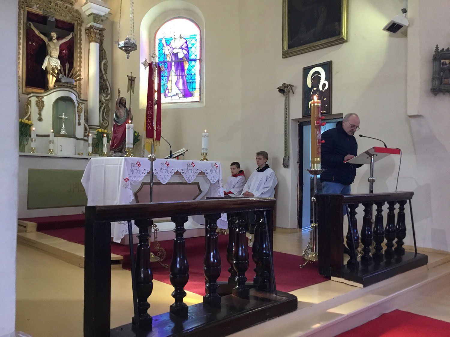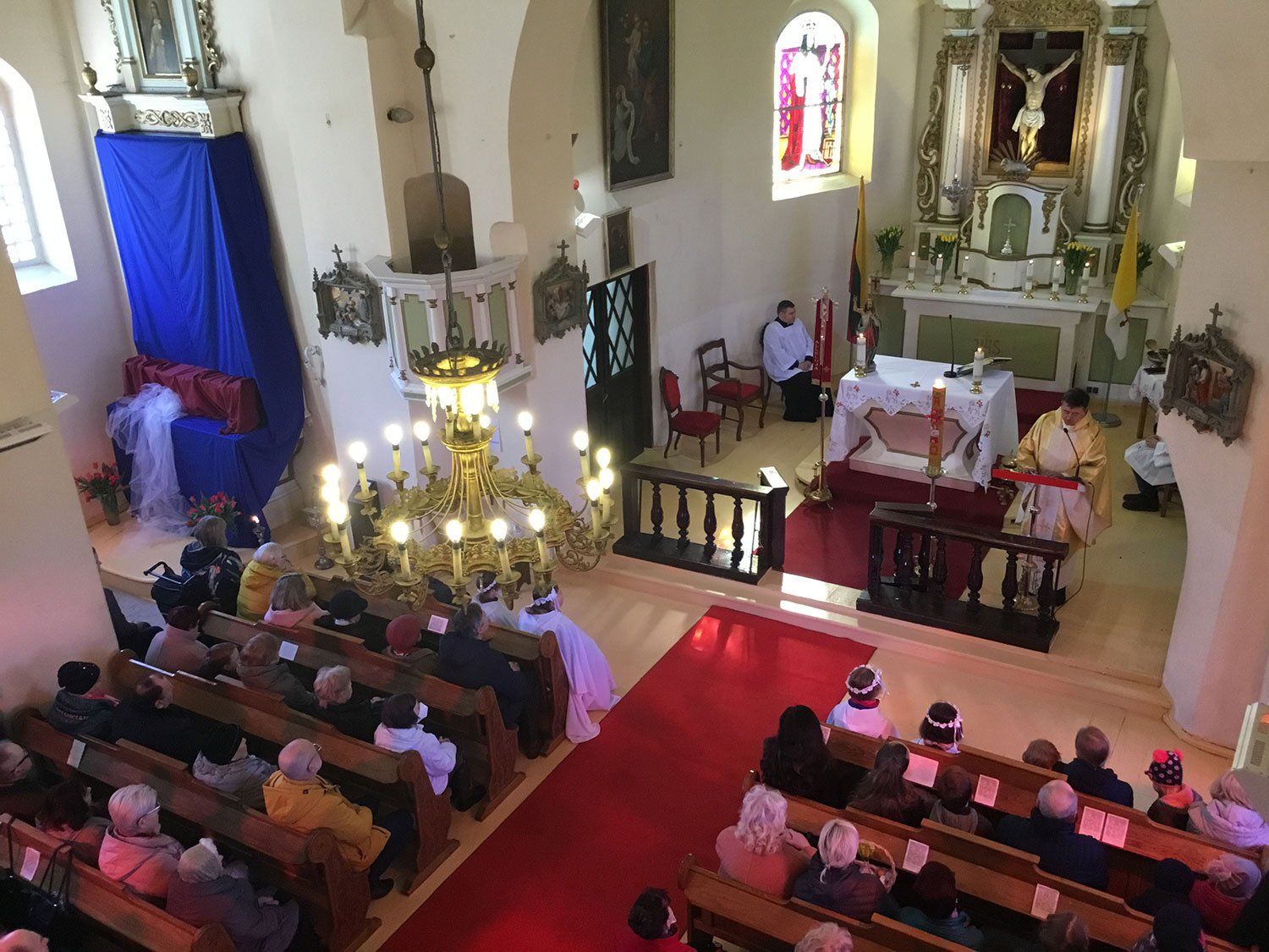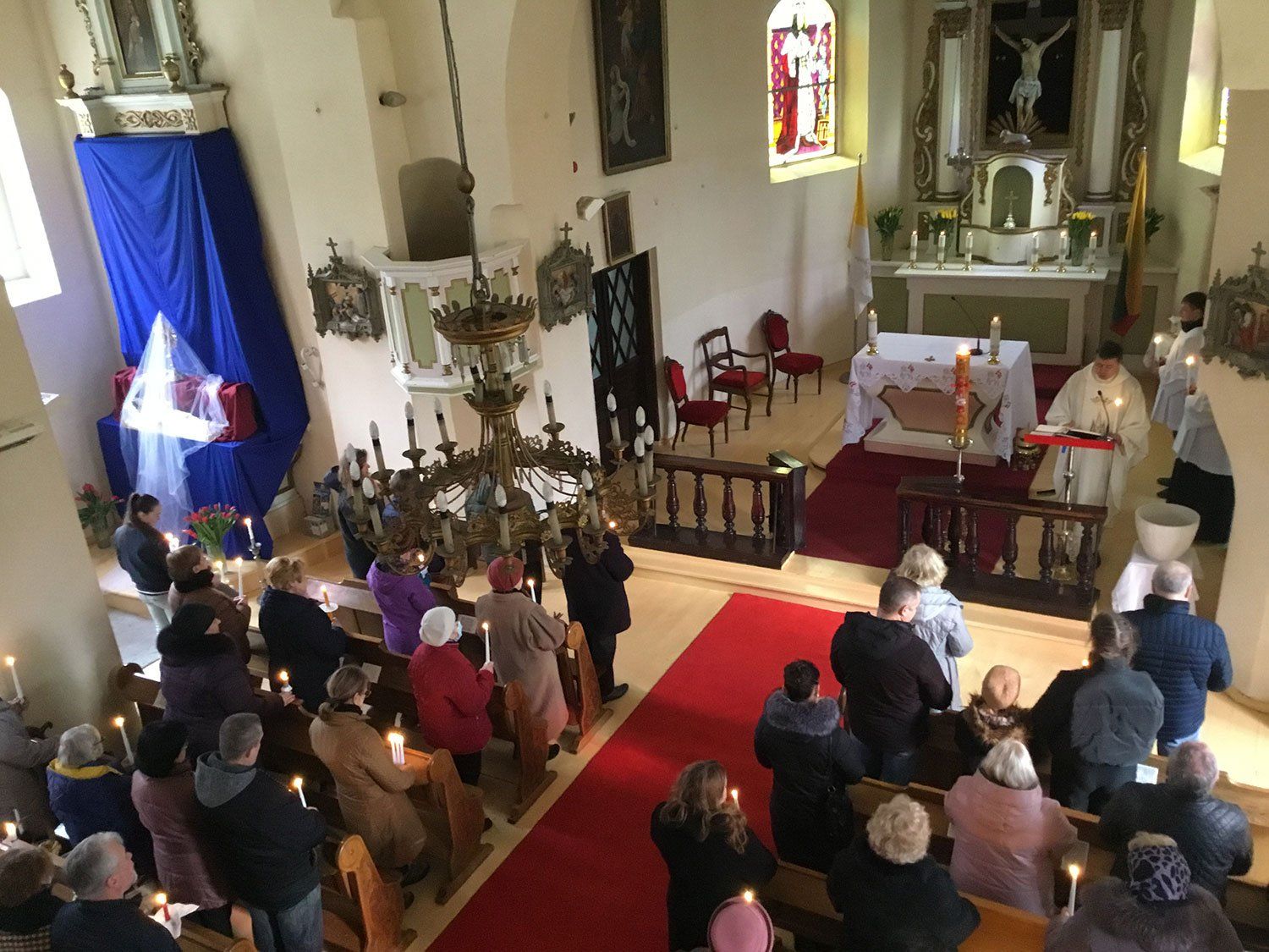Šventų Velykų iškilmės liturgijai vadovavo parapijos klebonas kun. Gintaras Pūras. Dvasininkui talkino liturginę praktiką atliekantis klierikas Mantas Šideikis. Klebonas Velykų proga pasveikino pamaldose gausiai dalyvavusius tikinčiuosius bei visiems nuoširdžiai palinkėjo būti vilties ir džiaugsmo žmonėmis skelbiančiais aplinkiniams žinią, kad „Kristus prisikėlė, iš tikrųjų prisikėlė!”