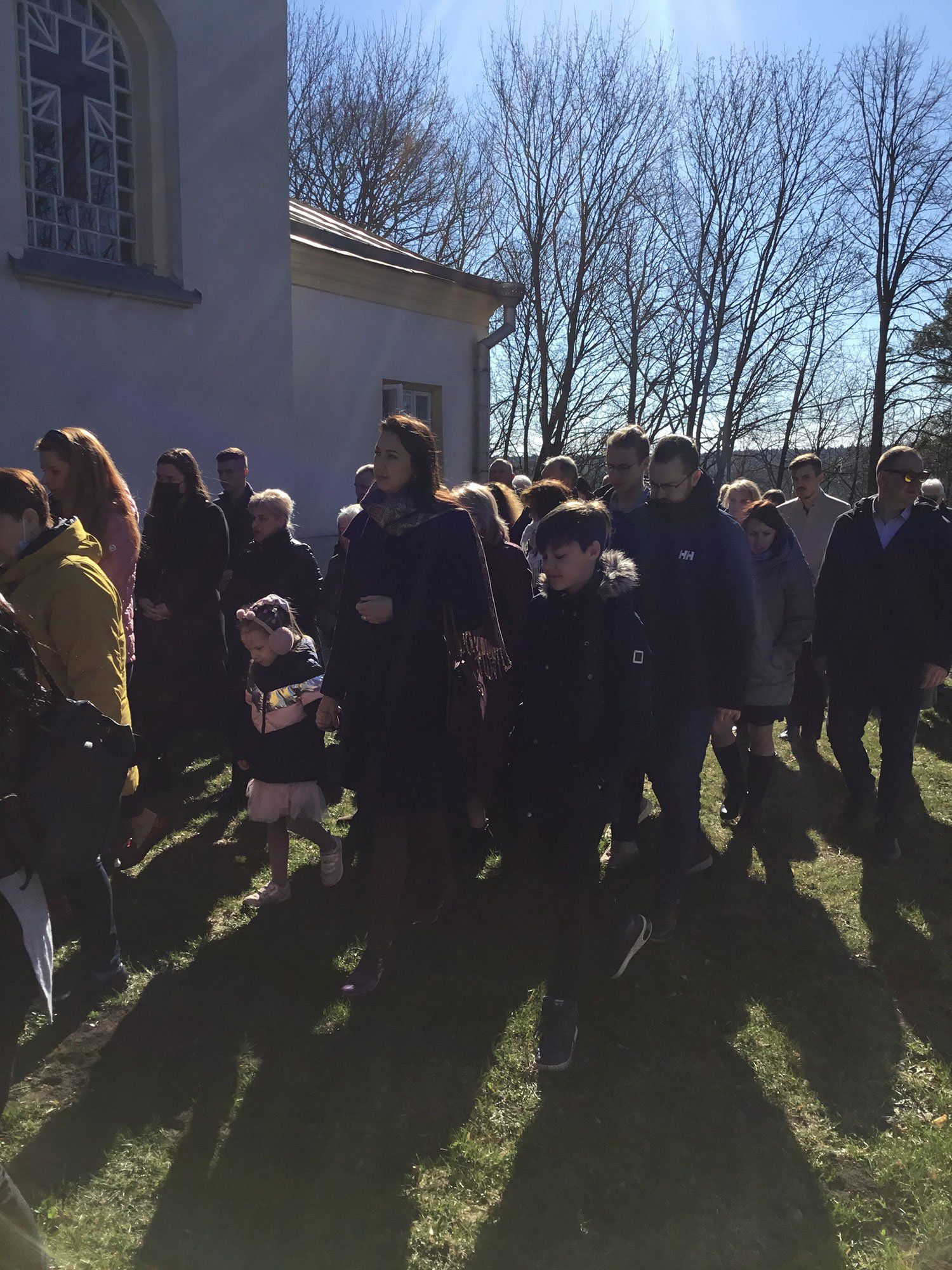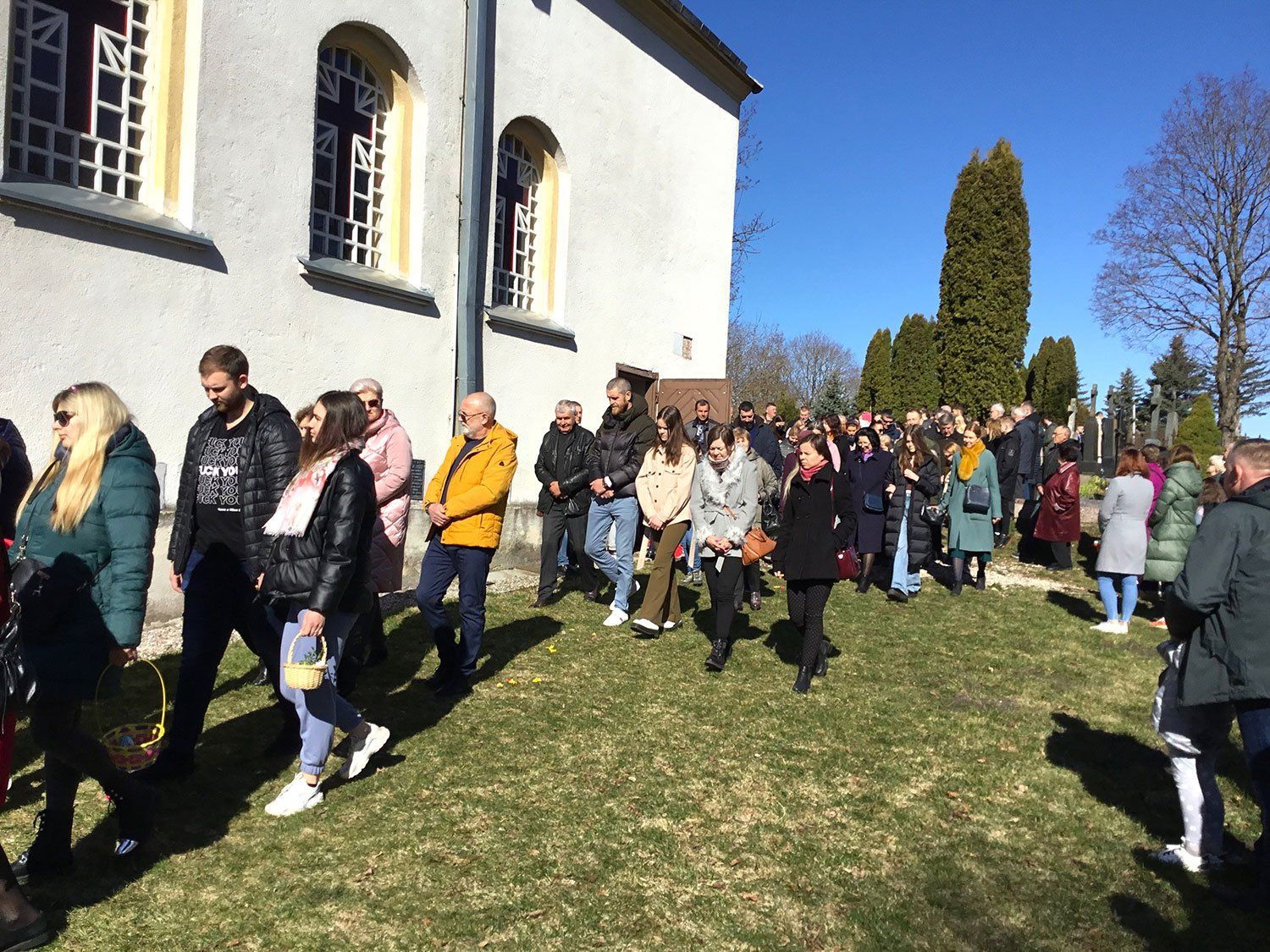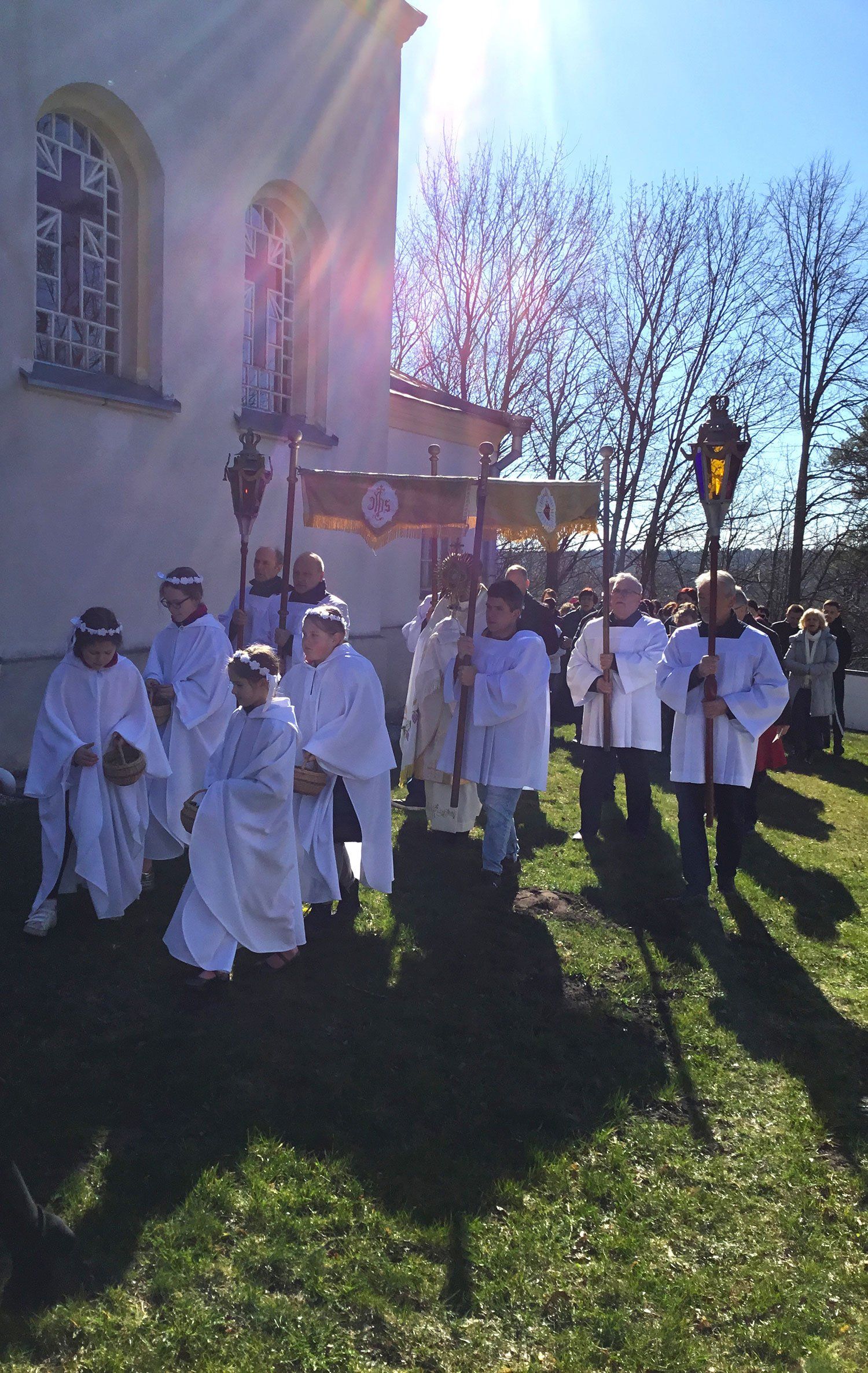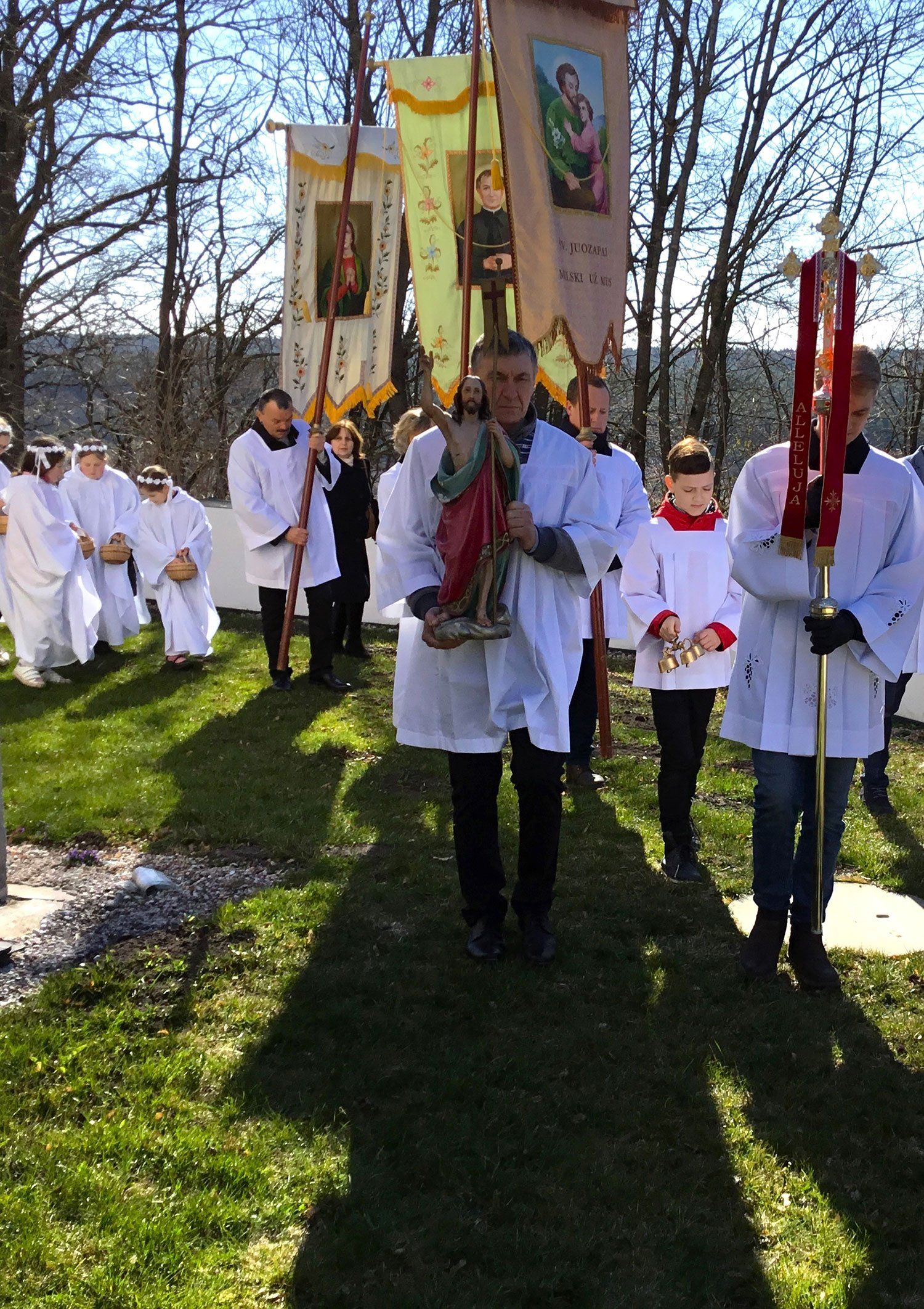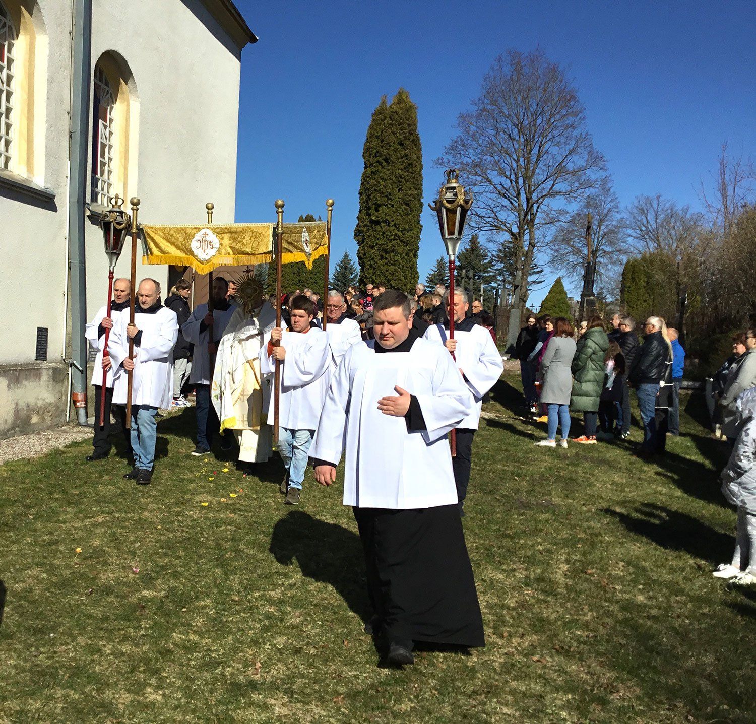 Balandžio 17 dieną, Velykų - Kristaus Prisikėlimo sekmadienį į pamaldas gausiai rinkosi parapijiečiai ir svečiai, bažnyčios šventoriuje rikiavosi šventinės eisenos dalyviai. Po dviejų metų pertraukos vėl buvo einama iškilminga šventinė eisena aplink bažnyčią. Velykų sekmadienio liturgijoje dalyvavo parapijos giesmininkai ir svečiai profesionalūs dūdoriai iš Kėdainių.