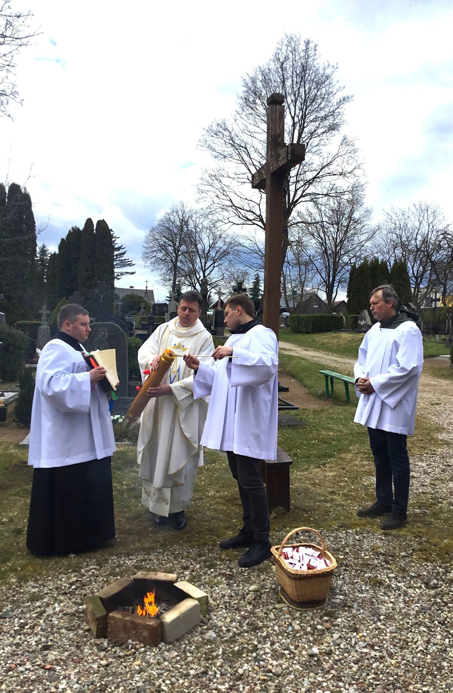 Vėliau dvasininkas perskaitė Kauno arkivyskupo metropolito Kęstučio Kėvalo sveikinimą Velykų proga.