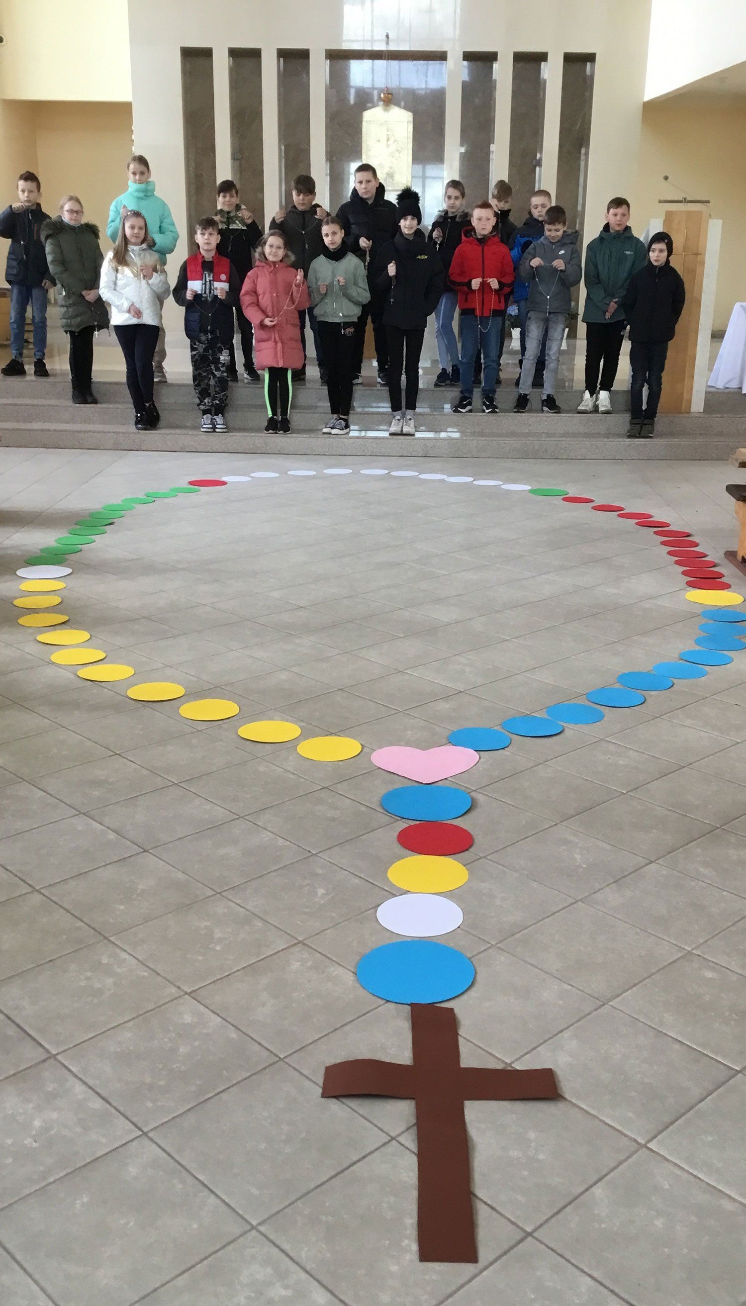 Vėliau bažnyčioje vaikai ir jų tėveliais dalyvavo Rožinio maldoje. Mažieji parapijiečiai atsinešė savo rožinius, pasidalino maldos patirtimi bei iš spalvoto popieriaus sudėjo Rožinį bažnyčioje. Rožinio maldai vadovavo mūsų parapijoje liturginę praktiką atliekantis klierikas Mantas ir parapijos katechetės.