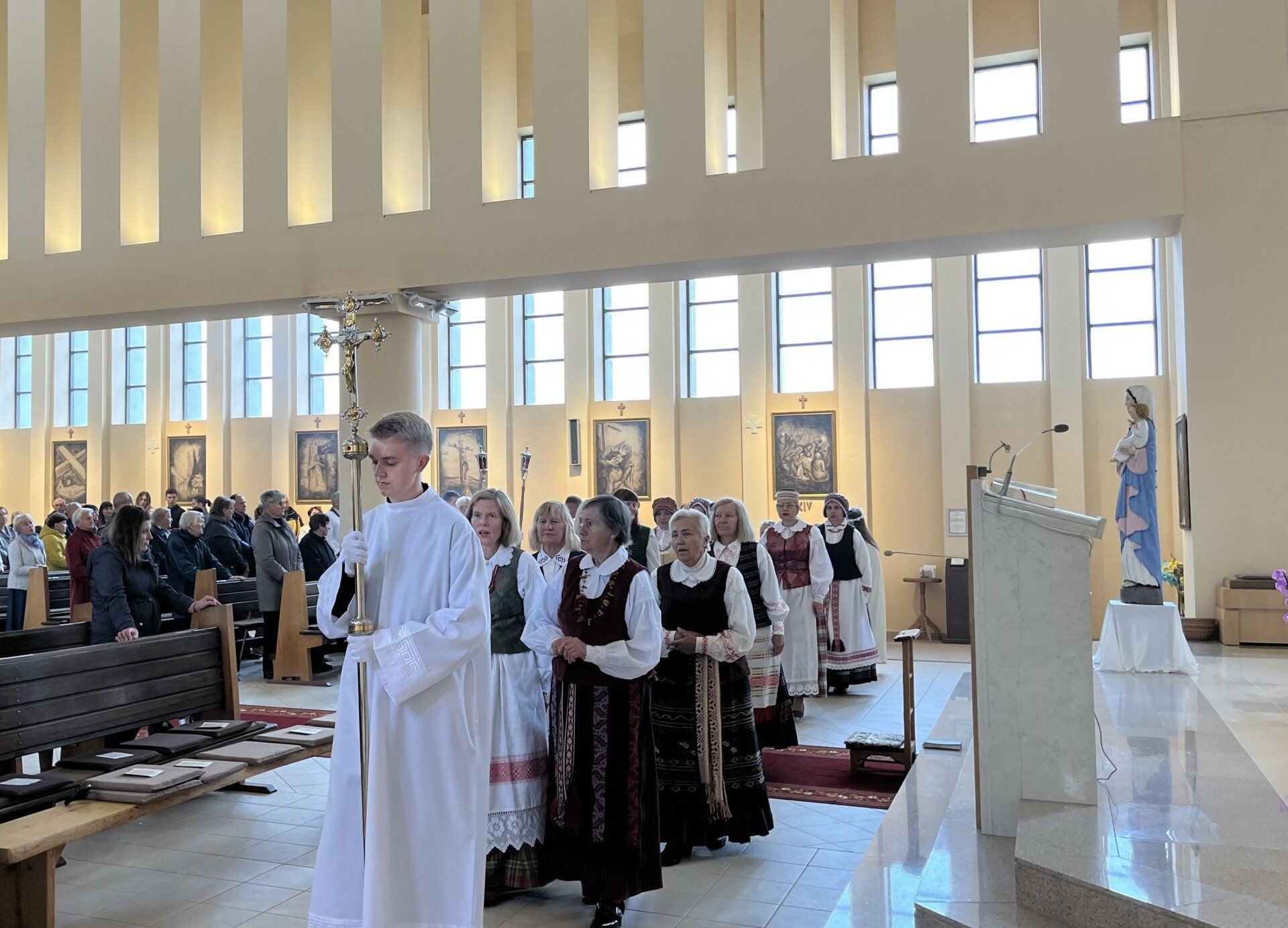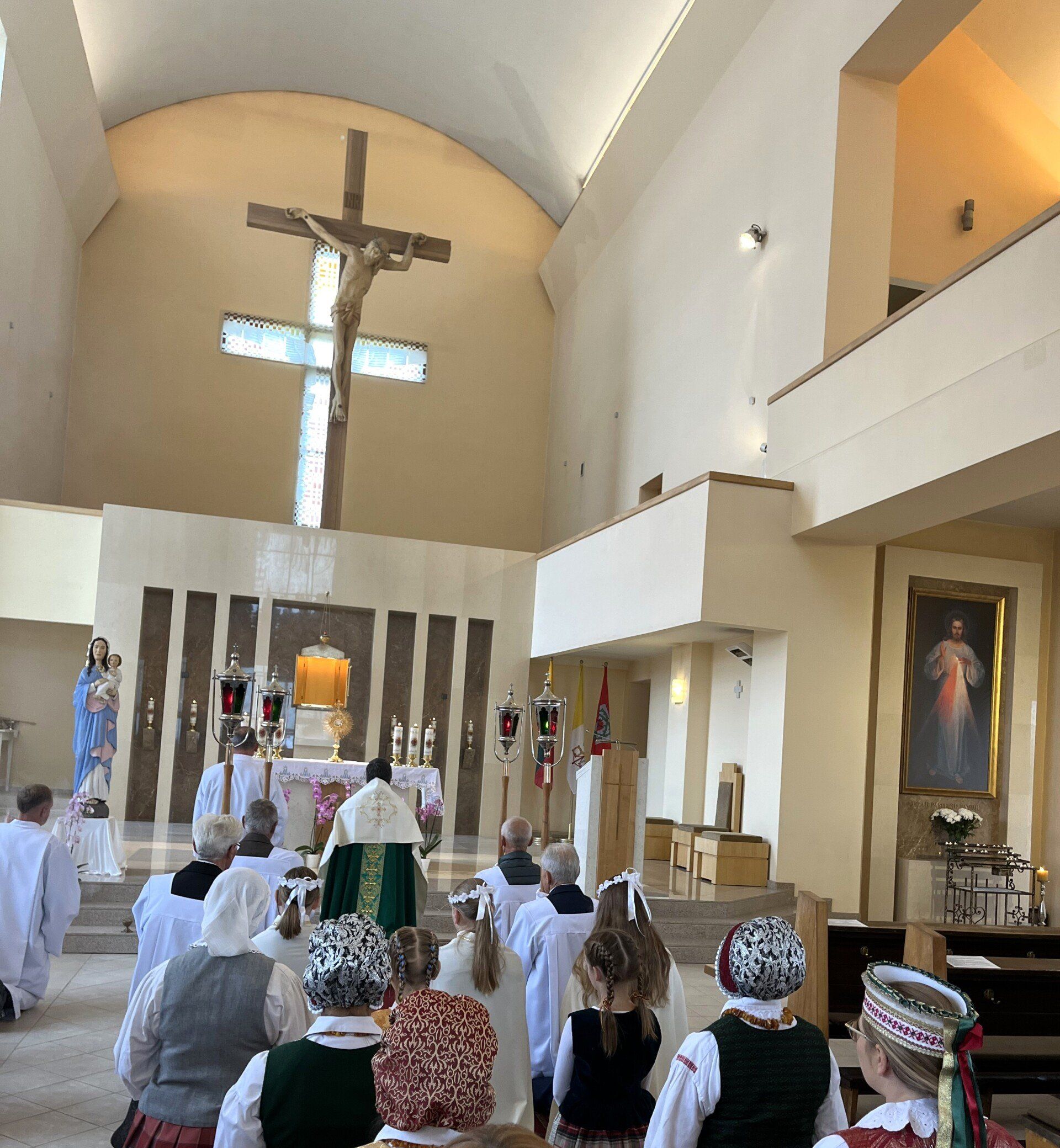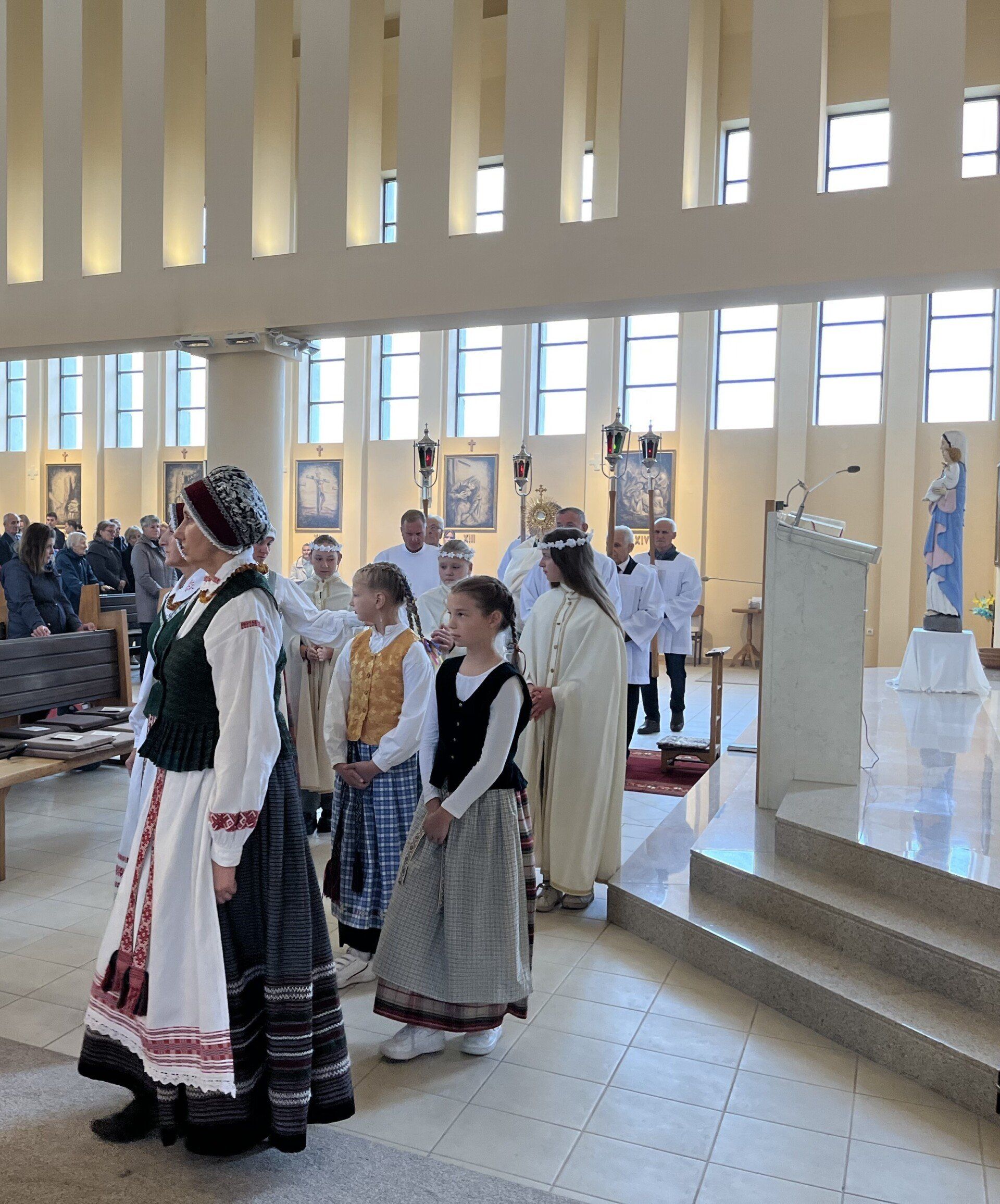 Pamaldų pabaigoje klebonas padėkojo procesijos dalyviams: zakristijonui, ministrantams, tautiniais drabužiais pasipuošusioms mergaitėms ir moterims.