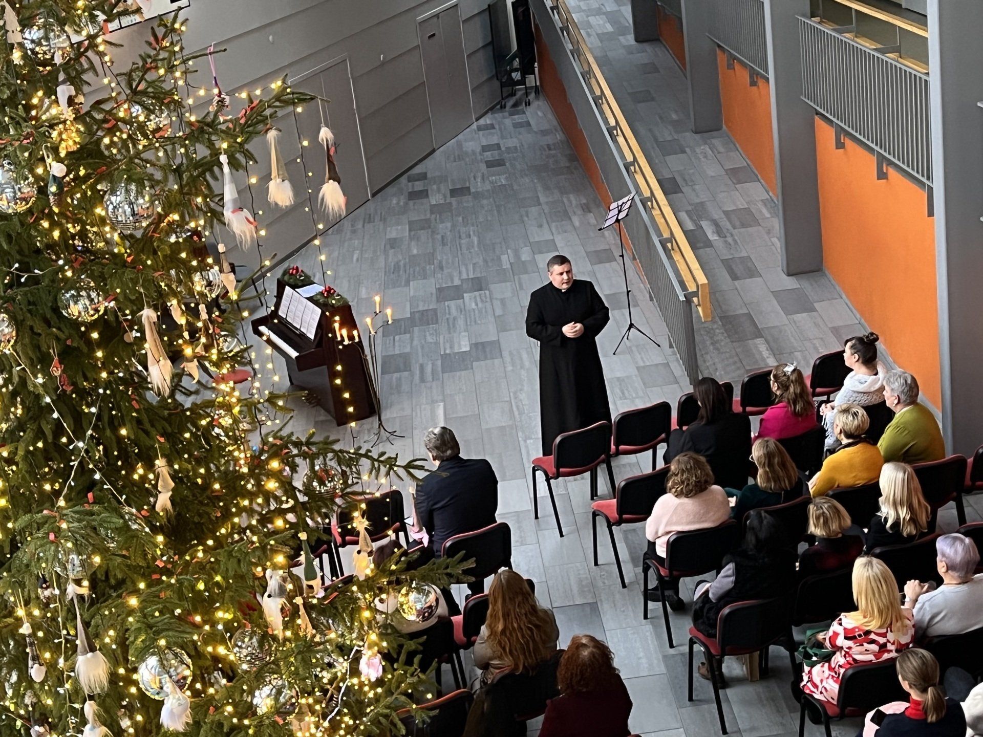 Diakonas Mantas Šideikis pasakė gražius žodžius artėjančių Kalėdų proga bei perdavė sveikinimą parapijos klebono kun. Gintaro Pūro vardu mokyklos bendruomenei.