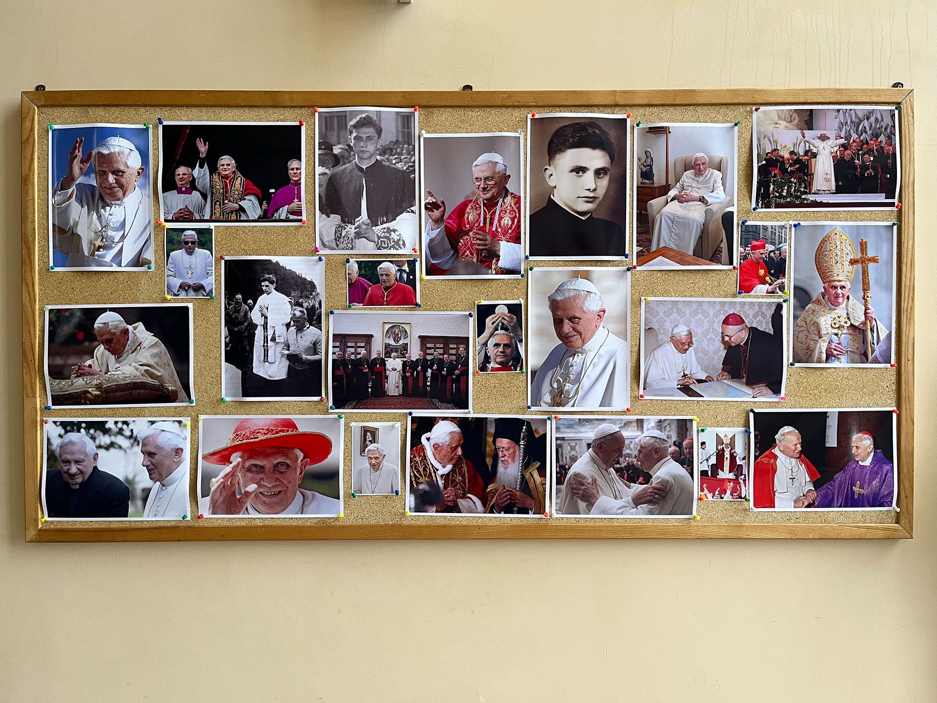 Domeikavos Lietuvos kankinių bažnyčioje įrengtas biografinių fotografijų stendas popiežiui Benediktui XVI atminti.