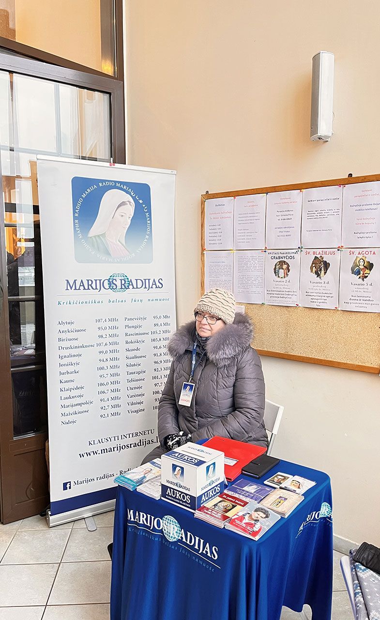 Bažnyčios prieangyje Marijos radijo savanoriai rinko aukas radijo išlaikymui bei platino informacinius lankstinukus apie krikščionybę bei pal. Karolį Akutį.