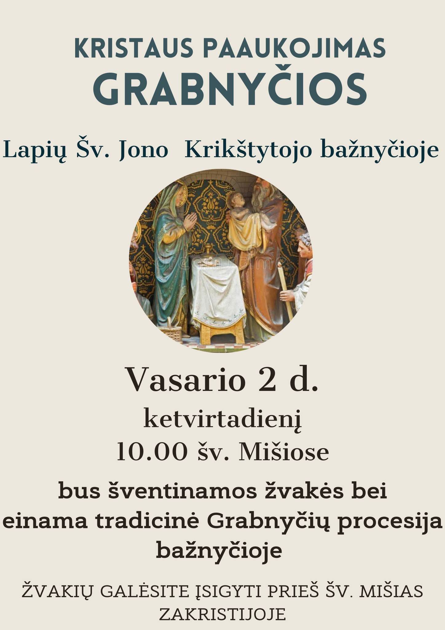 Vasario 2 d., ketvirtadienį šventėme Grabnyčias – Kristaus paaukojimo šventę. Lapių bažnyčioje 10.00 valandą šv. Mišias aukojo bei Grabnyčių procesijai bažnyčioje vadovavo parapijos klebonas kun. Gintaras Pūras. Vėliau dvasininkas palaimino žmonių atsineštas žvakes. Prieš šv. Mišias žvakių buvo galima įsigyti Lapių bažnyčios zakristijoje.
