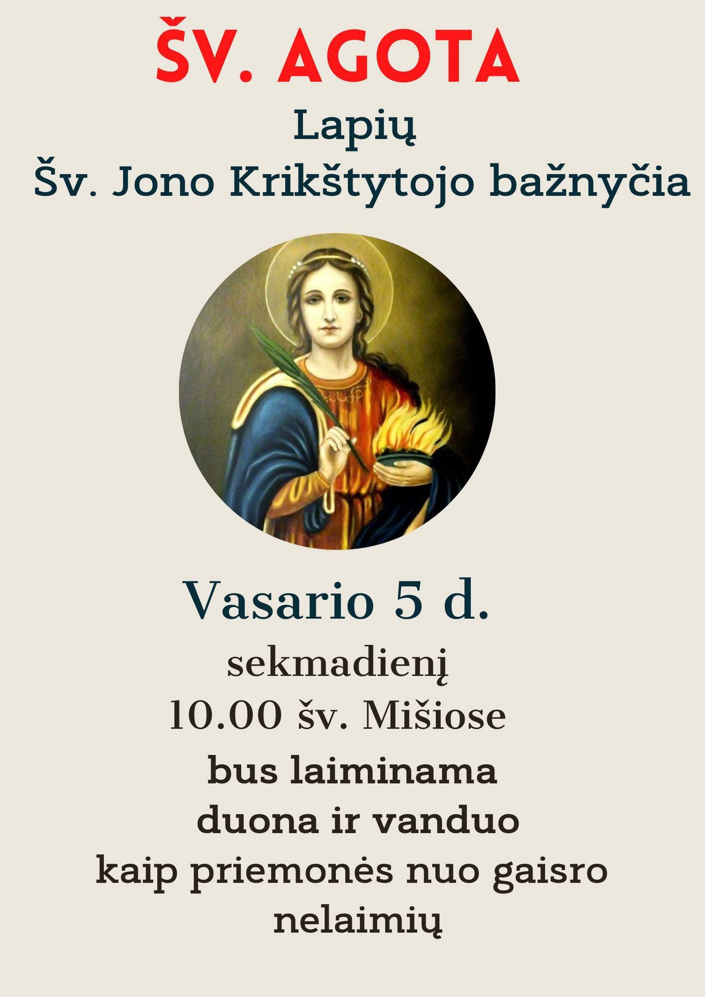 Vasario 5 d., sekmadienį minėjome Šv. Agotą. Pamaldose melsimės už bažnyčios ir parapijos geradarius ir rėmėjus. Vėliau šv. Mišių liturgijai vadovavęs parapijos klebonas kun. Gintaras Pūras palaimino vandenį ir duoną, kaip priemones nuo gaisrų ir kitų nelaimių. Po šv. Mišių žmonės buvo kviečiami parsinešti į savo namus sakramentalijas – gabalėlį šv. Agotos duonos ir vandens.