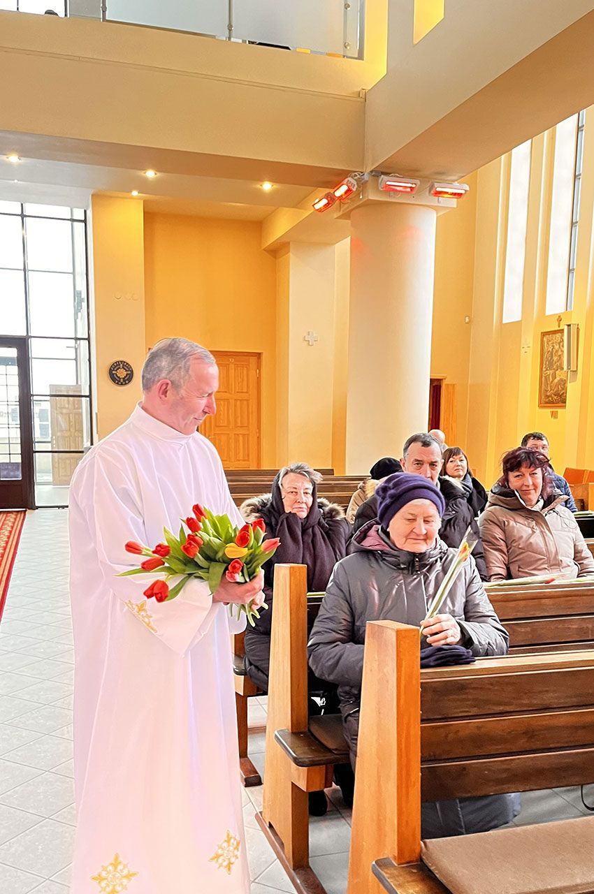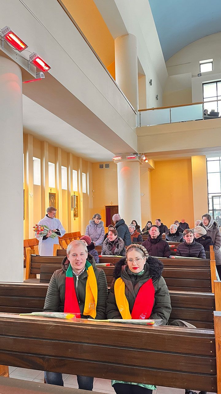 Domeikavos Lietuvos kankinių bažnyčioje susirinkusiems svarbios valstybei ir visiems jos piliečiams šventės proga įteikėme Trispalvės spalvų pavasario žiedus.