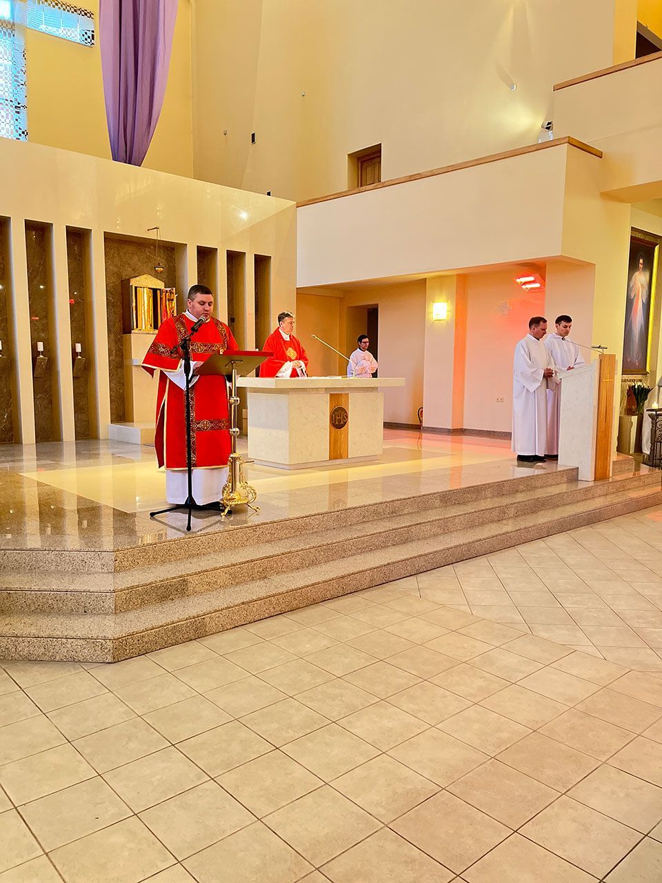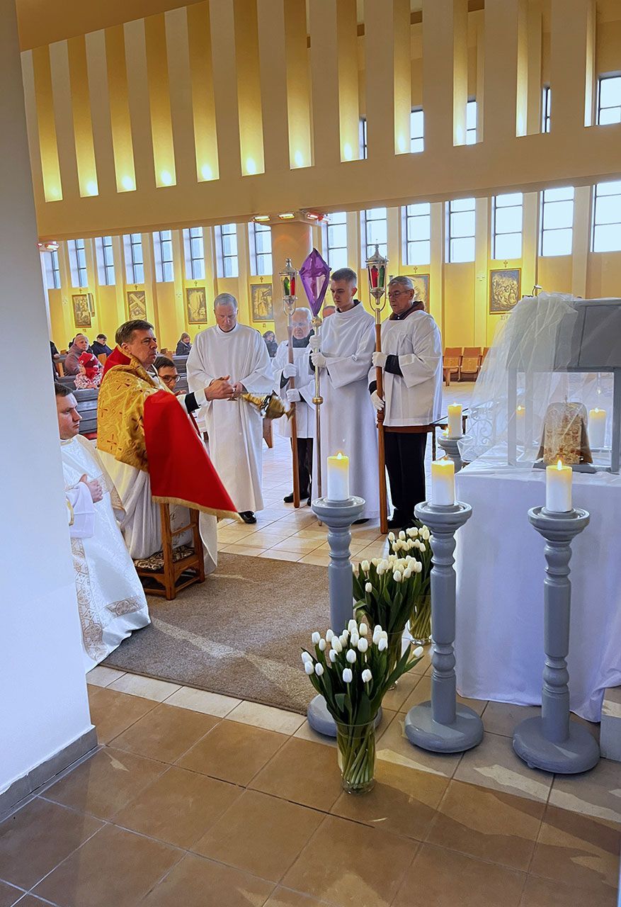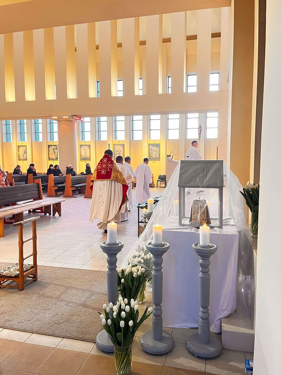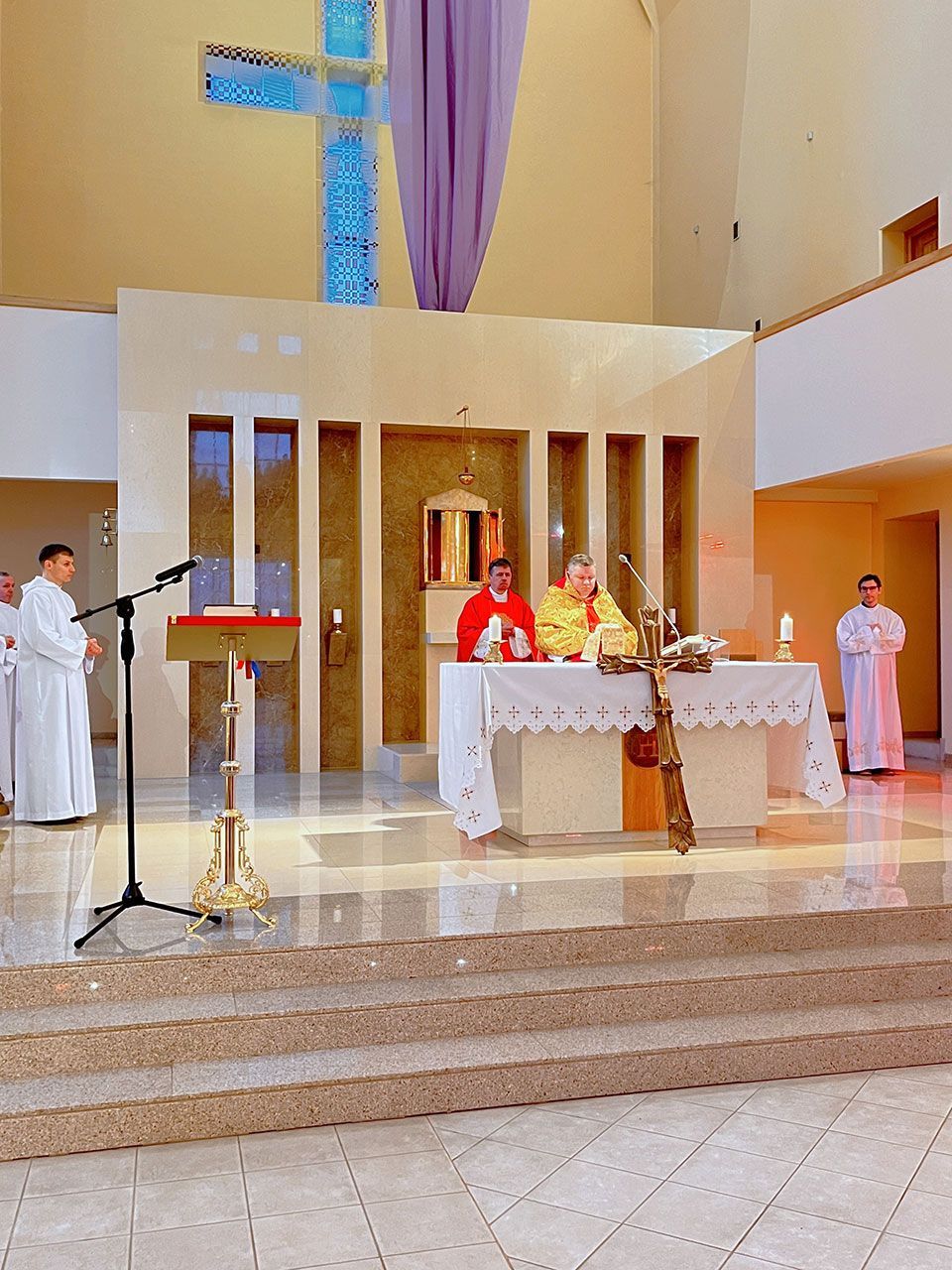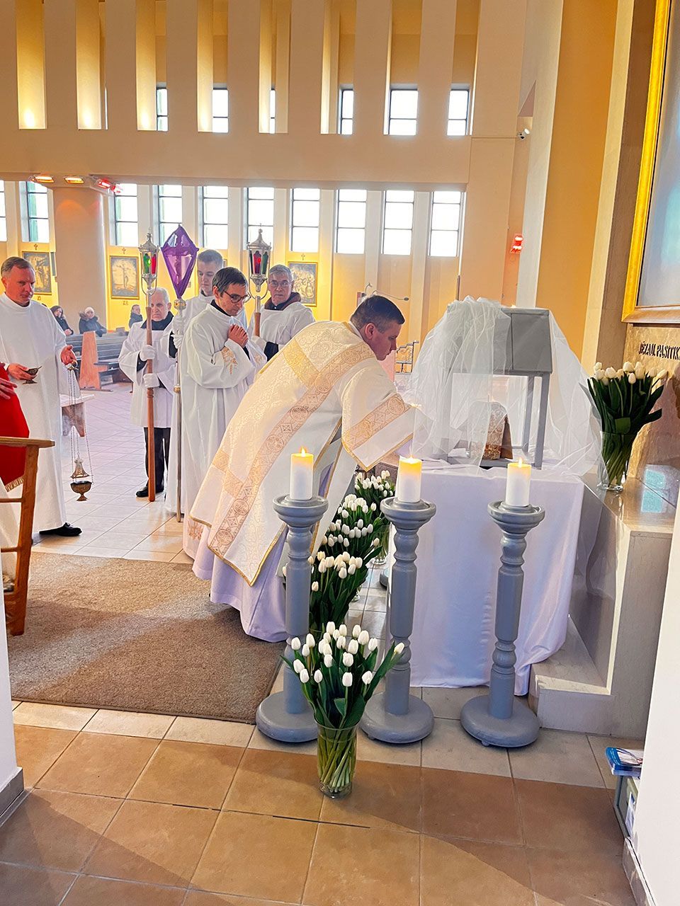 Balandžio 6 d., ketvirtadienio vakarą minėjome Eucharistijos įsteigimą Velykų vakarienėje, Jėzaus su mokiniais valgytoje Jeruzalėje. Mišių pradžioje, primenant Eucharistijos sakramento įsteigimą, „Garbė Dievui aukštybėse” skambant varpams iškilmingai giedojo parapijos choras. Po komunijos komuninė su procesija nunešta į parengtą altorėlį. Po pamaldų tikintieji pasiliko trumpai adoracijai.