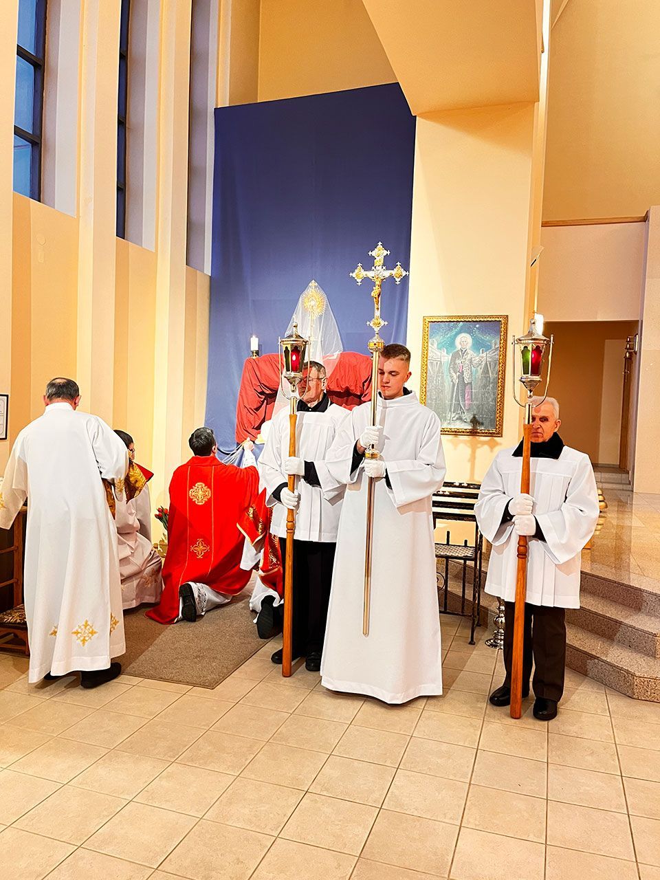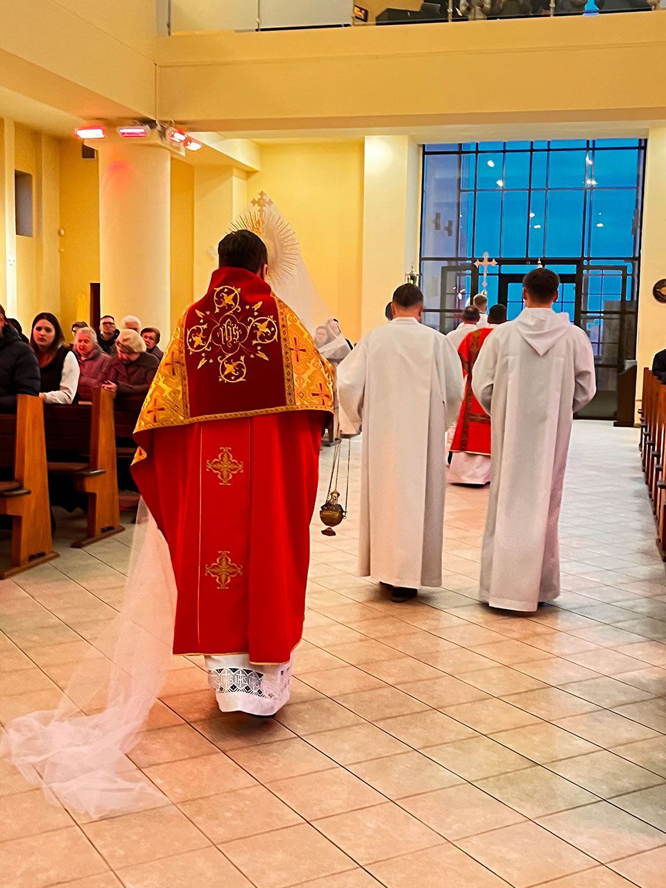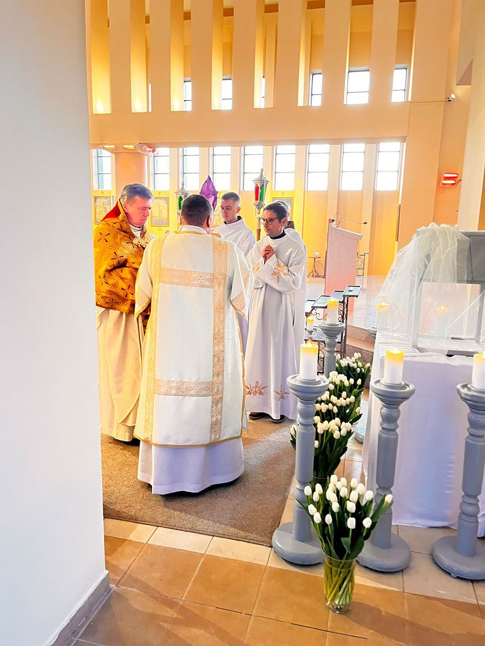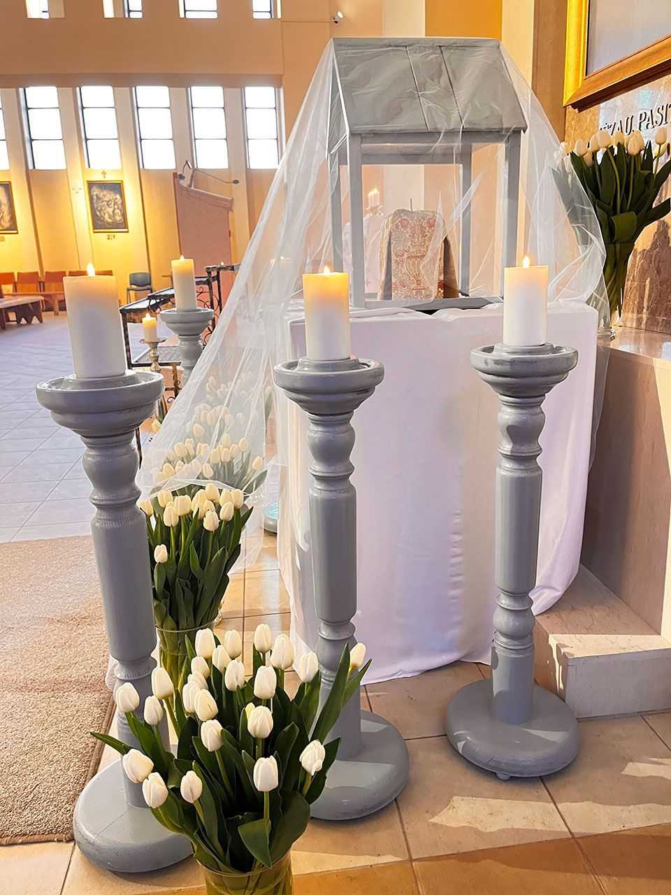 Balandžio 6 d., ketvirtadienio vakarą minėjome Eucharistijos įsteigimą Velykų vakarienėje, Jėzaus su mokiniais valgytoje Jeruzalėje. Mišių pradžioje, primenant Eucharistijos sakramento įsteigimą, „Garbė Dievui aukštybėse” skambant varpams iškilmingai giedojo parapijos choras. Po komunijos komuninė su procesija nunešta į parengtą altorėlį. Po pamaldų tikintieji pasiliko trumpai adoracijai.
