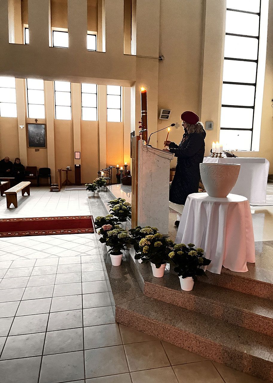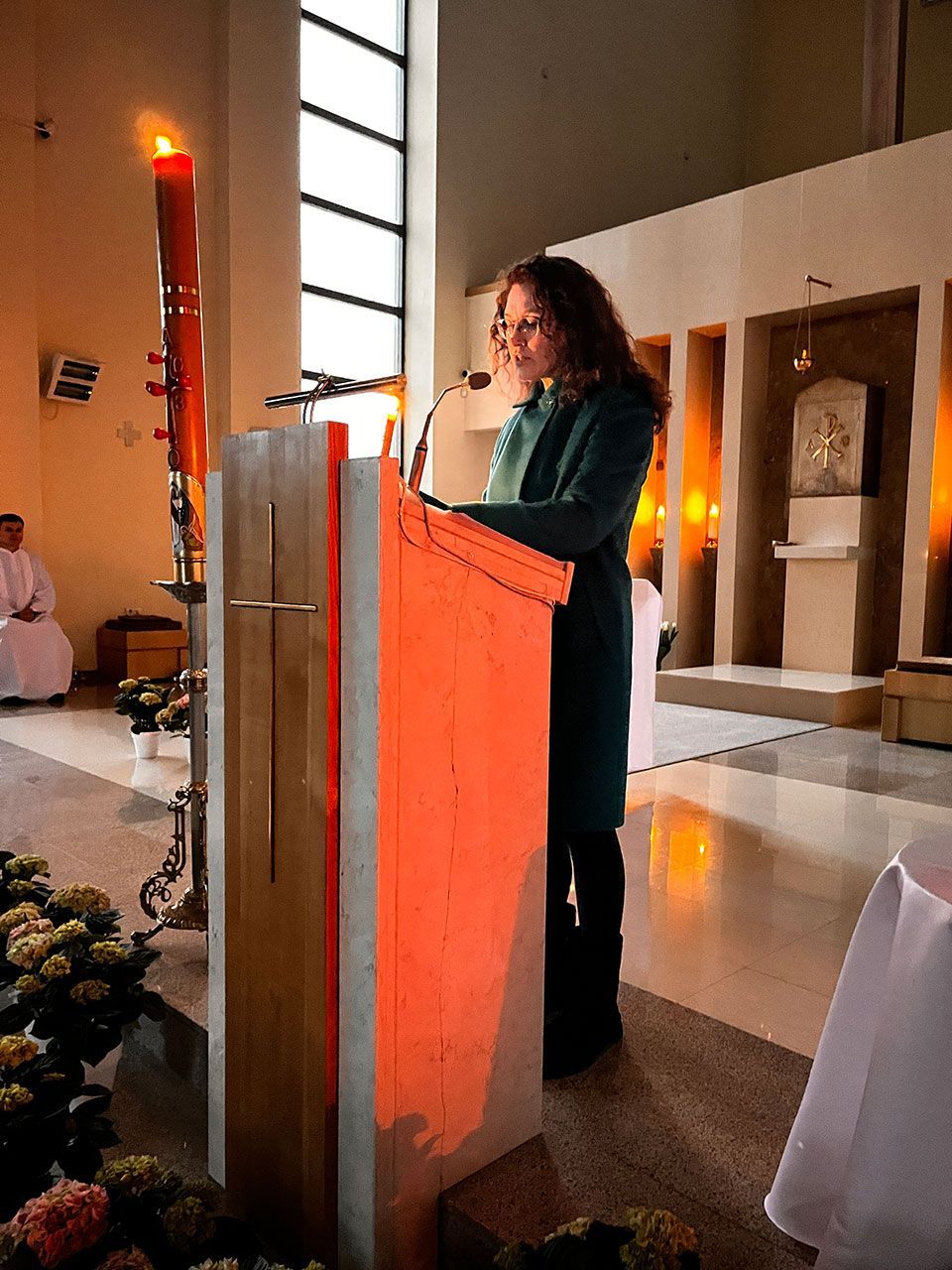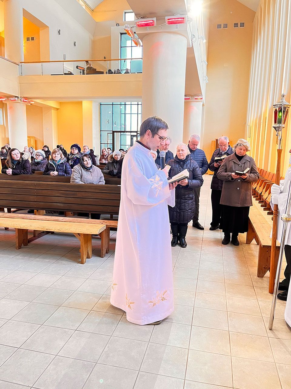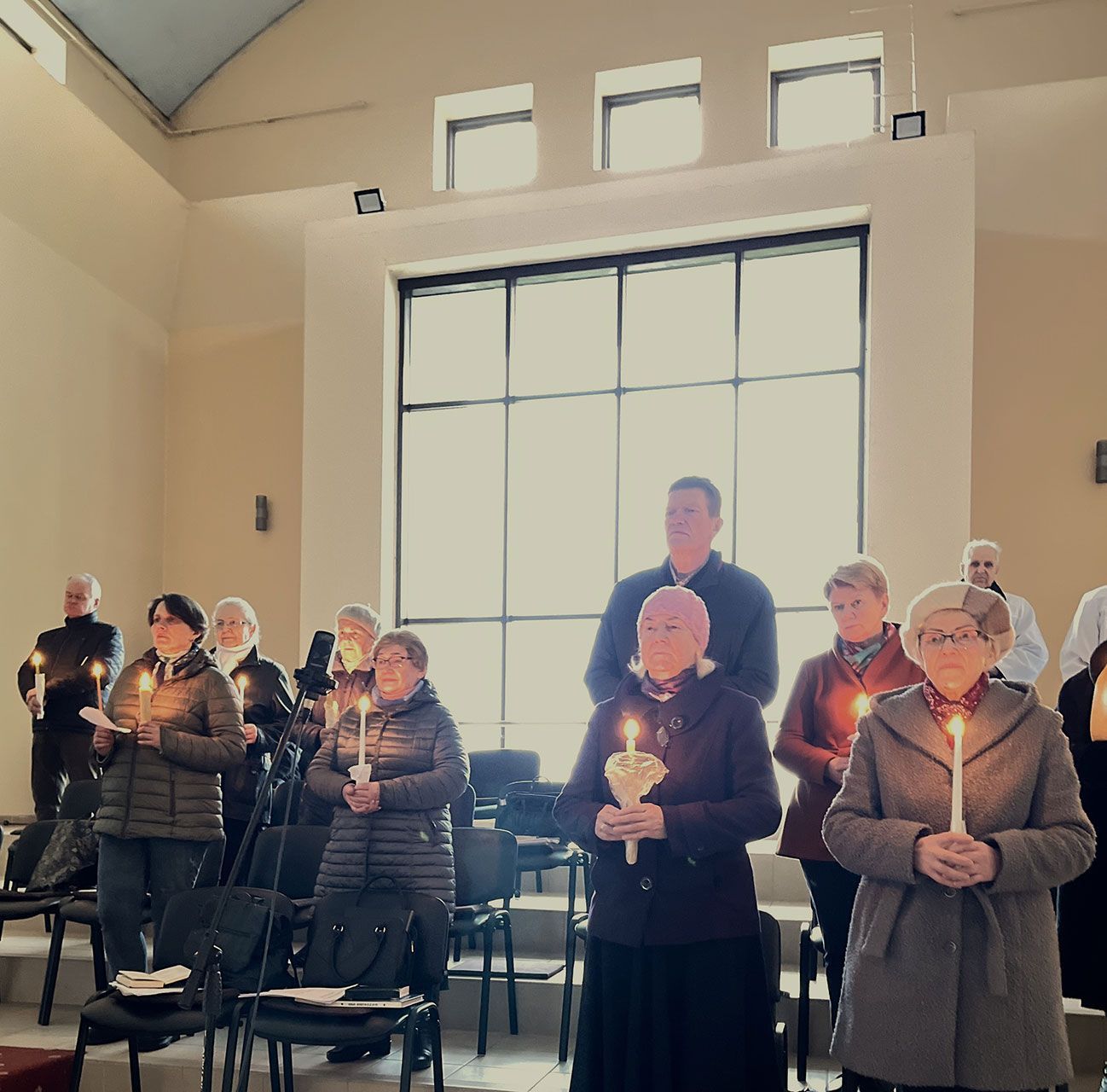 Po šlovinimo giesmės pradėjome Žodžio liturgiją. Skaitovai skaitė septynis skaitinius, buvo giedamos psalmės, meldžiamasi.