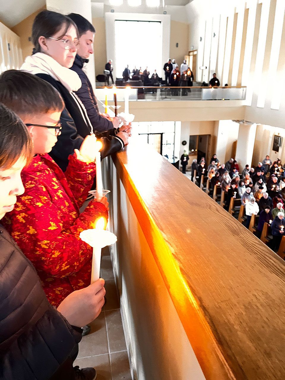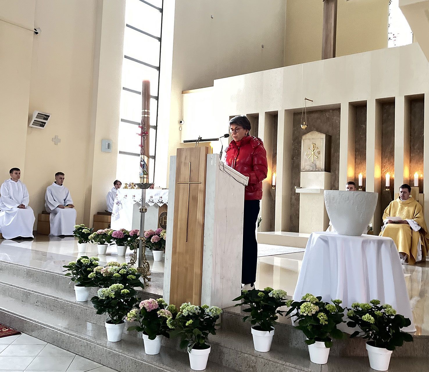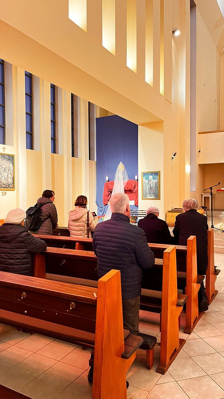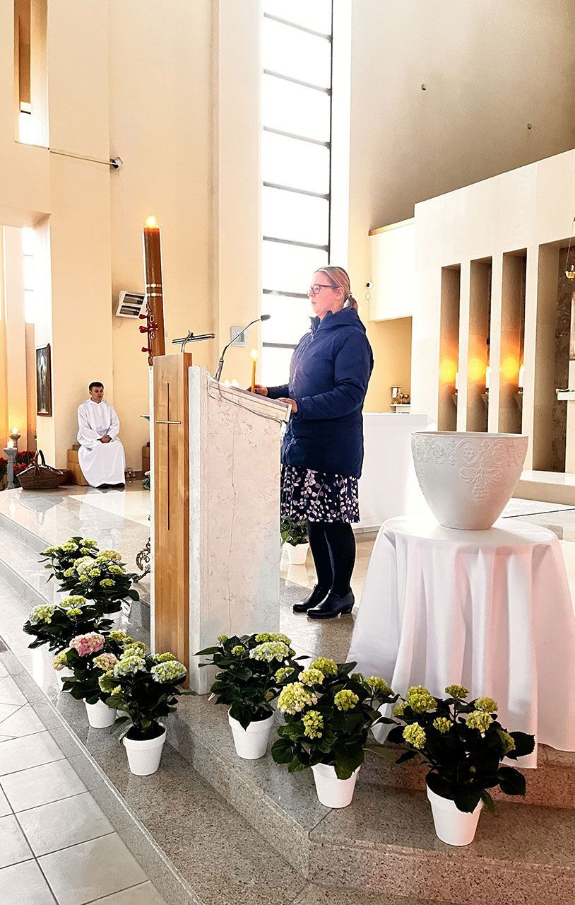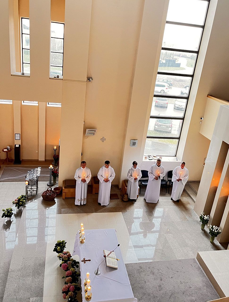 Po šlovinimo giesmės pradėjome Žodžio liturgiją. Skaitovai skaitė septynis skaitinius, buvo giedamos psalmės, meldžiamasi.