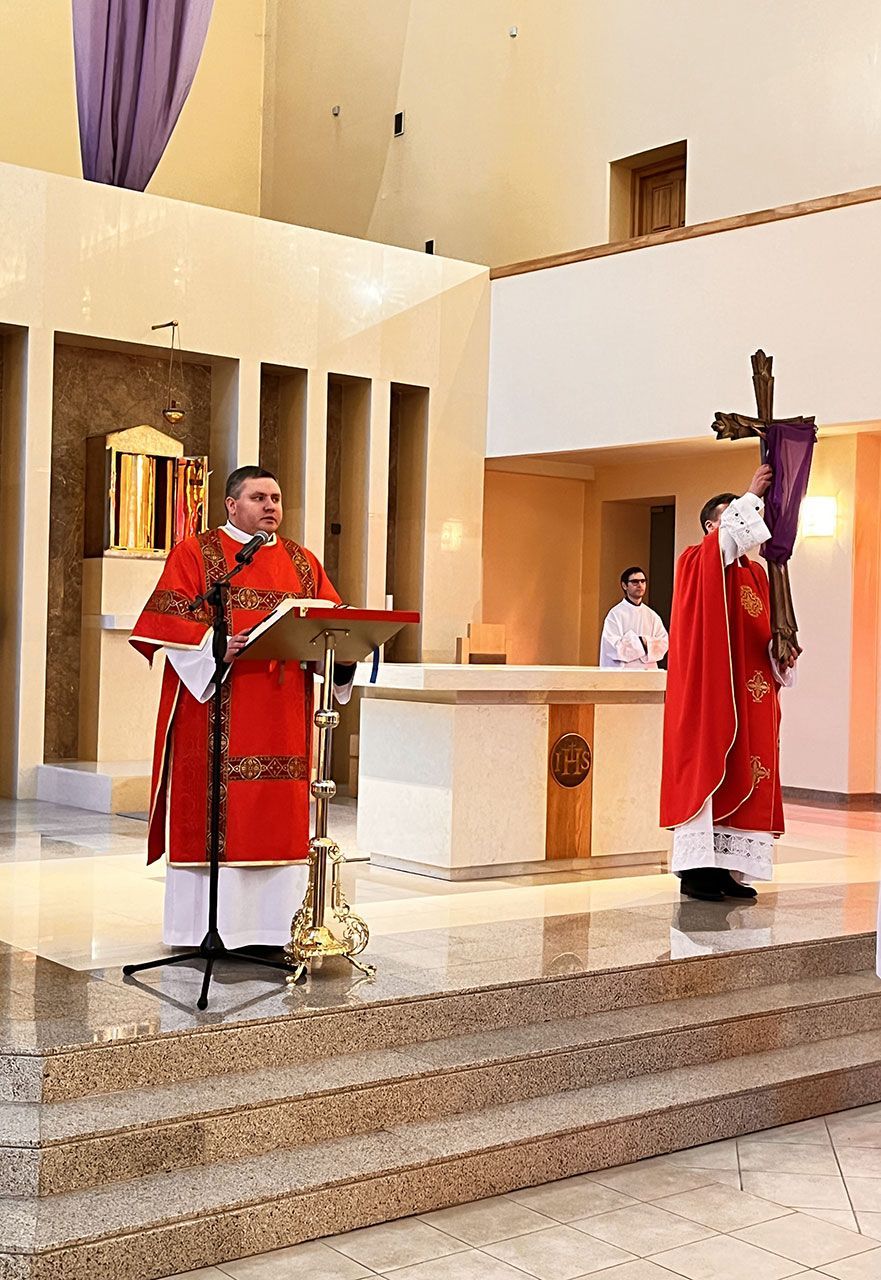 Balandžio 7 d. Didžiojo penktadienio liturgija skirta Viešpaties Kančios minėjimui, šv. Mišios neaukojamos. Didįjį penktadienį bažnyčioje negrojo muzika, nudengtas altorius. Bažnyčioje buvo einamas Kryžiaus kelias bei skaitoma Viešpaties Kančios istorija. Didįjį penktadienį tikintieji gali gauti visuotinius atlaidus už Kryžiaus pagerbimą. Didįjį penktadienį tikintieji kviečiami laikytis pasninko.