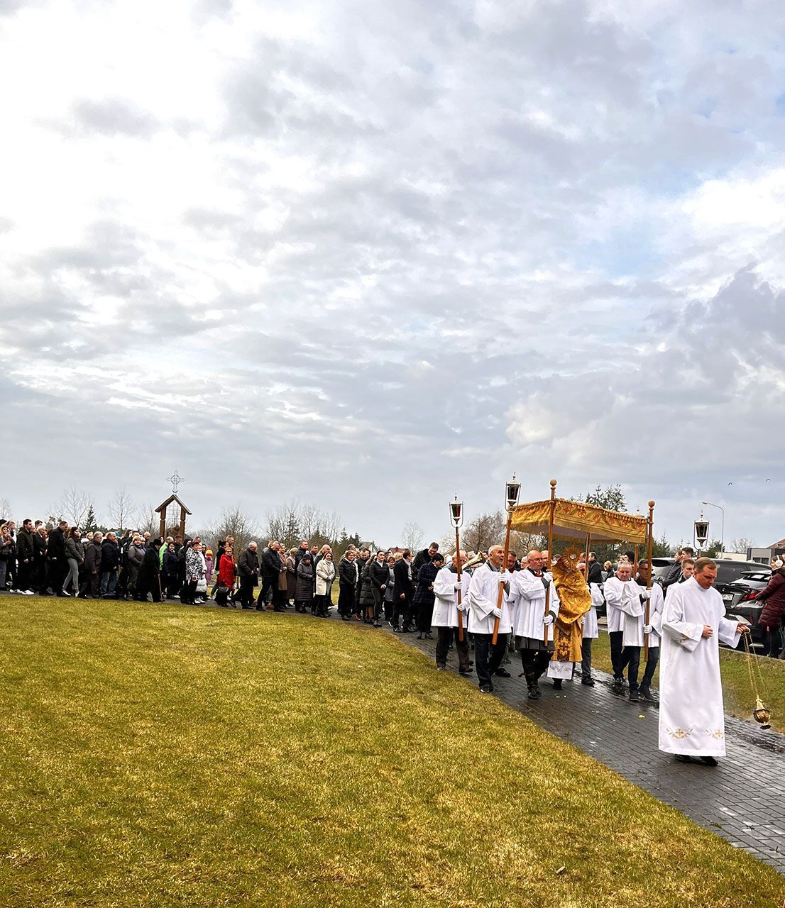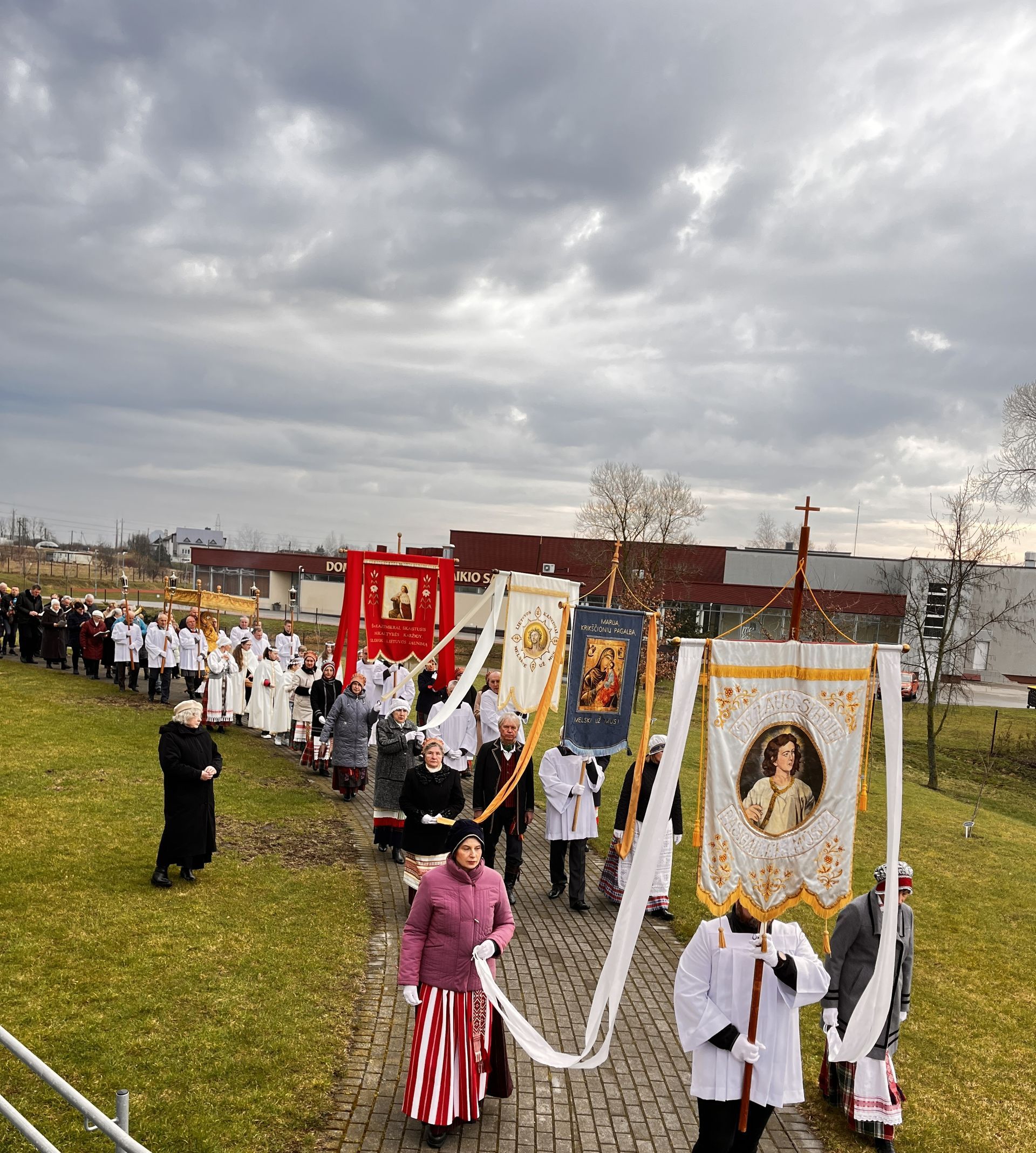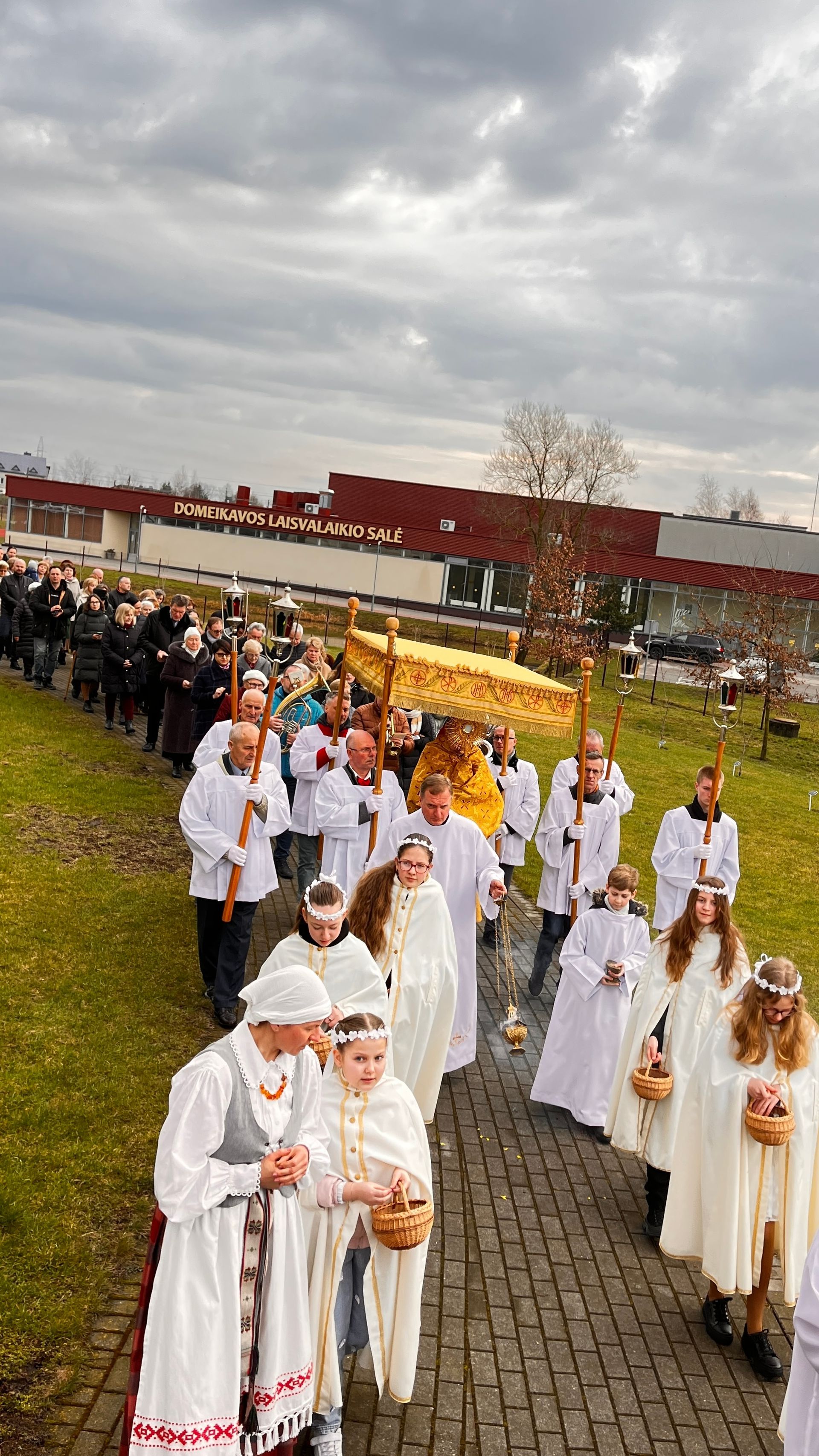Buvo einama iškilminga velykinė procesija aplink bažnyčią. Vėliau dvasininkas perskaitė Kauno arkivyskupo Kęstučio Kėvalo velykinį sveikinimą tikintiesiems.