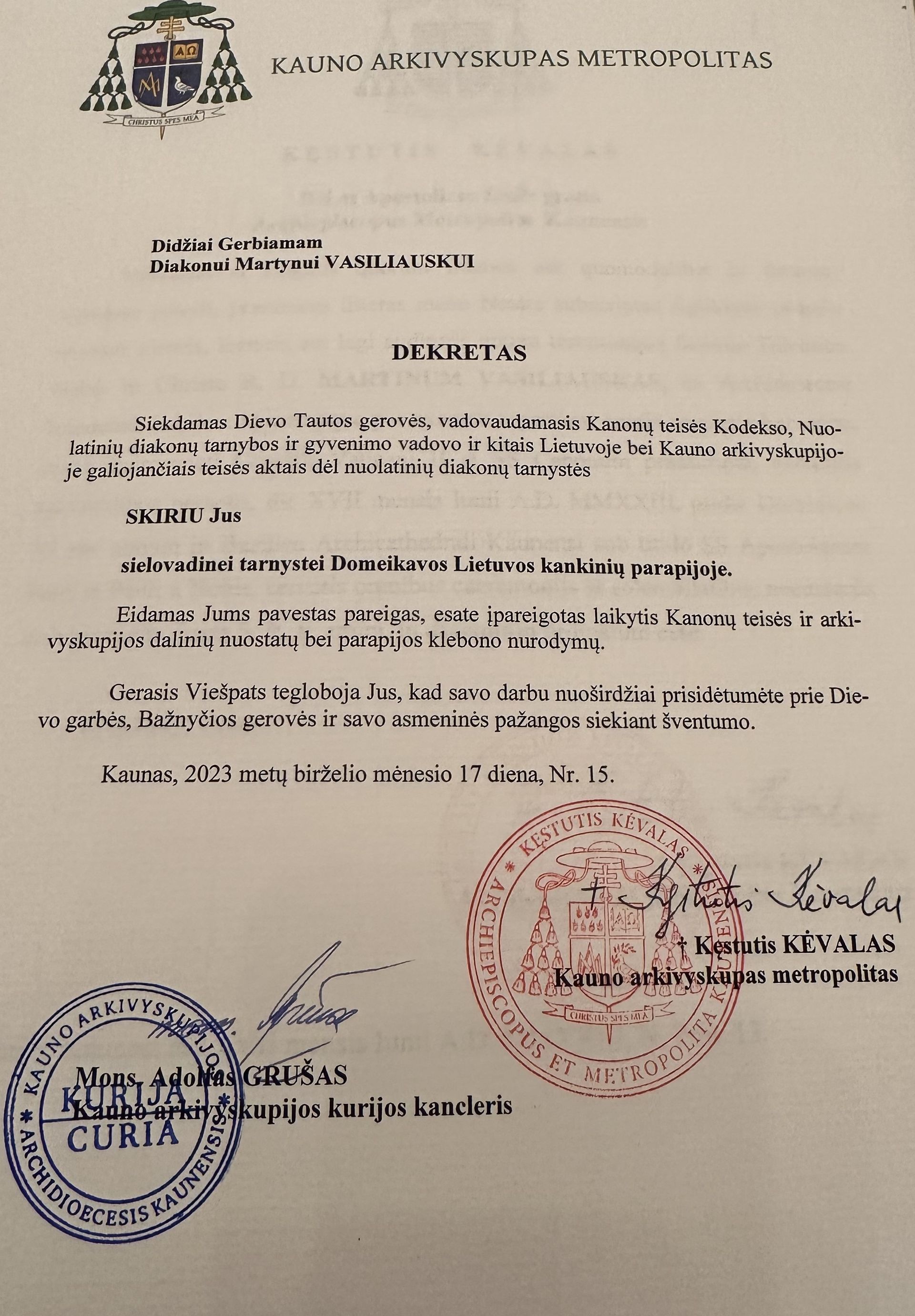 Birželio 17 dieną Kauno arkikatedroje bazilikoje vyko nuolatinių diakonų šventimai. Šv. Mišioms vadovavo arkivyskupas metropolitas Kęstutis Kėvalas. Iškilmingos Eucharistijos metu arkivyskupas suteikė diakono šventimus domeikaviškiui Martynui Vasiliauskui ir Arūnui Kučikui.