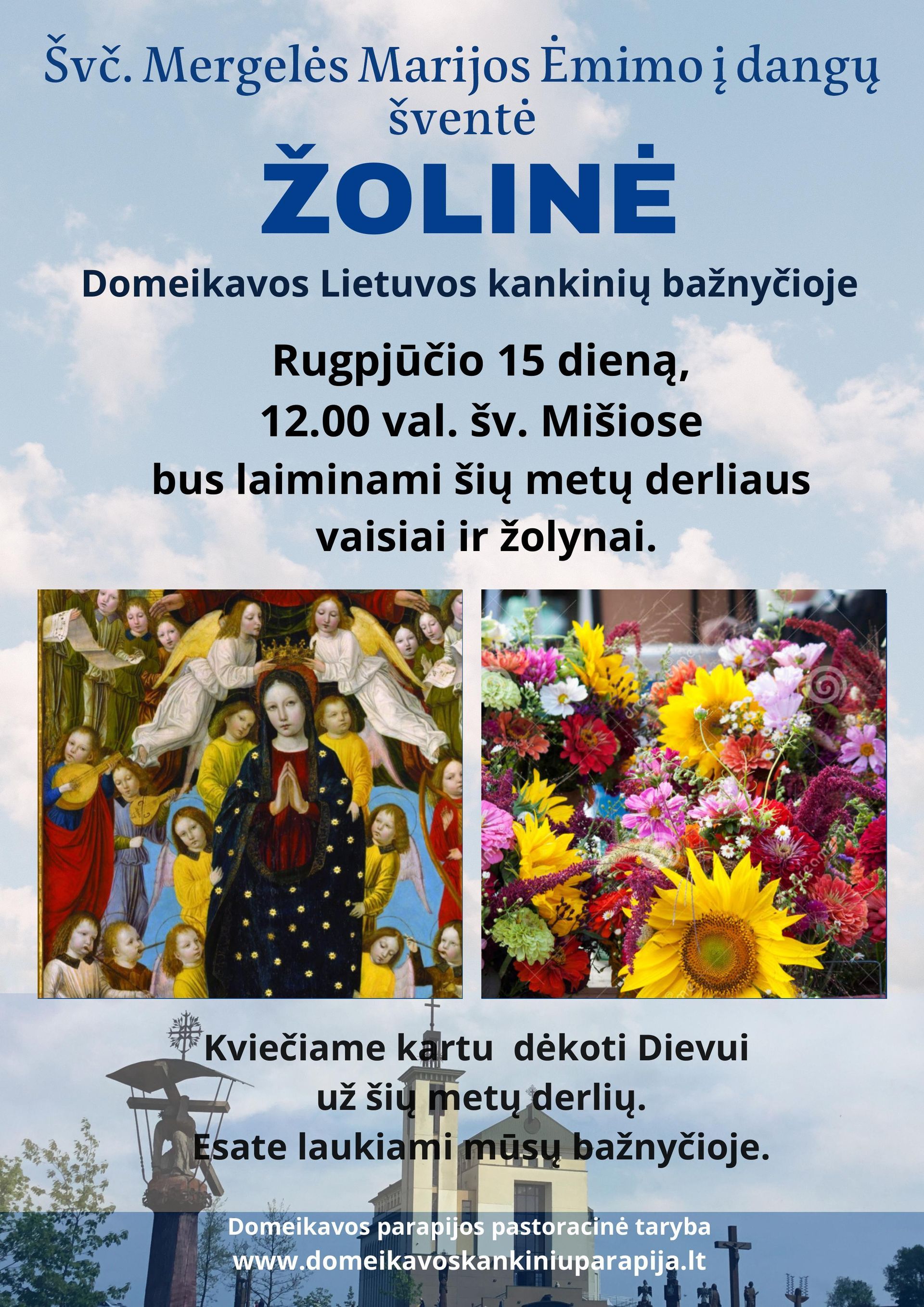 Domeikavos ir Lapių bažnyčiose Žolinės šventę organizuoti padėjo mūsų laisvalaikio salių šaunios kultūros darbuotojos Nerija Krugliakovienė ir Jurga Marmaitė. Po pamaldų Domeikavos bažnyčioje šventinį koncertą dovanojo vyrų vokalinis ansamblis „Beržai”. Lapių bažnyčioje koncertavo operos solistai Gabrielė Kuzmickaitė ir Martynas Žukauskas.