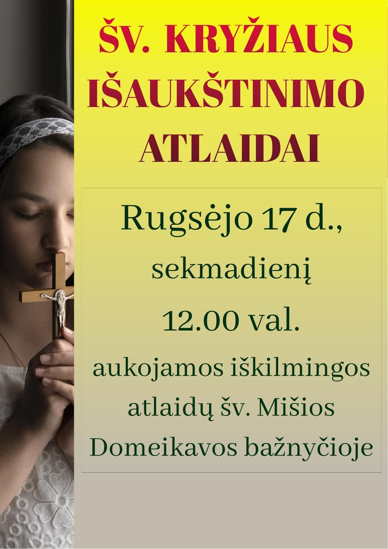 Rugsėjo 17 d., sekmadienį Domeikavos Lietuvos kankinių parapijoje buvo švenčiami Šventojo Kryžiaus Išaukštinimo atlaidai. Parapijos klebonas kun. Gintaras Pūras aukojo iškilmingas atlaidų šv. Mišias už parapiją ir atlaidų dalyvius. Pamaldų pražioje Šv. Kryžių pagerbėme procesija. Giedojo mūsų parapijos choras.