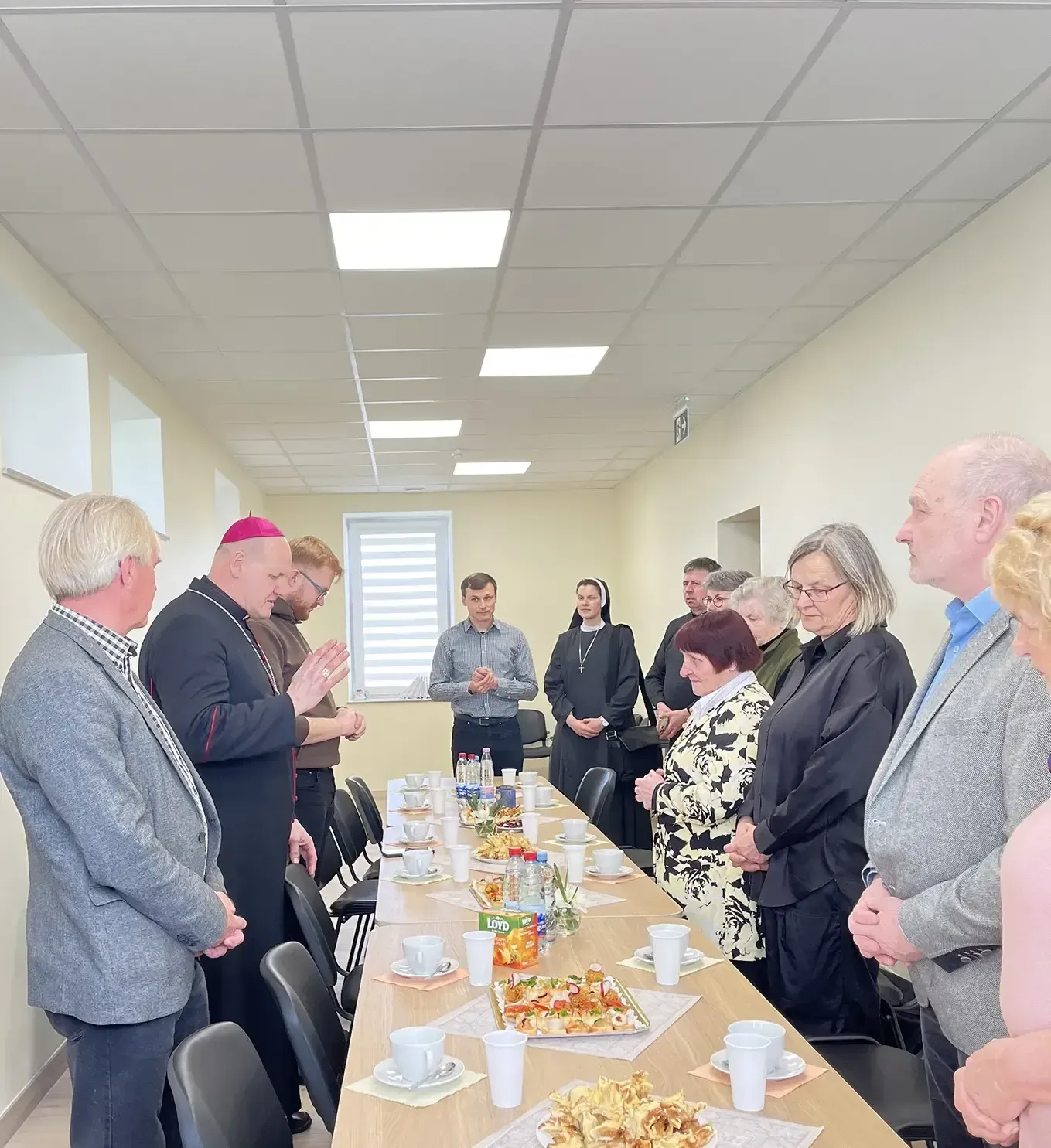 Dienai įpusėjus, kvietėme į agapę Domeikavos parapijos namuose. Brangų svečią vyskupą S. Bužauską pasitiko Domeikavos ir Lapių parapijų pastoracinių tarybų nariai bei aktyvūs parapijiečiai. Jaukioje aplinkoje kalbėjome apie parapijose atliktus ir vykdomus sielovados bei kasdienius ūkinius darbus. Vėliau savo veiklas pristate Kauno arkivyskupijos katechetikos, jaunimo ir šeimos centrų atstovai. Buvome pakviesti skleisti žinią savo aplinkoje apie vykdomas gražias iniciatyvas Kauno arkivyskupijoje bei dalyvauti būsimuose renginiuose.