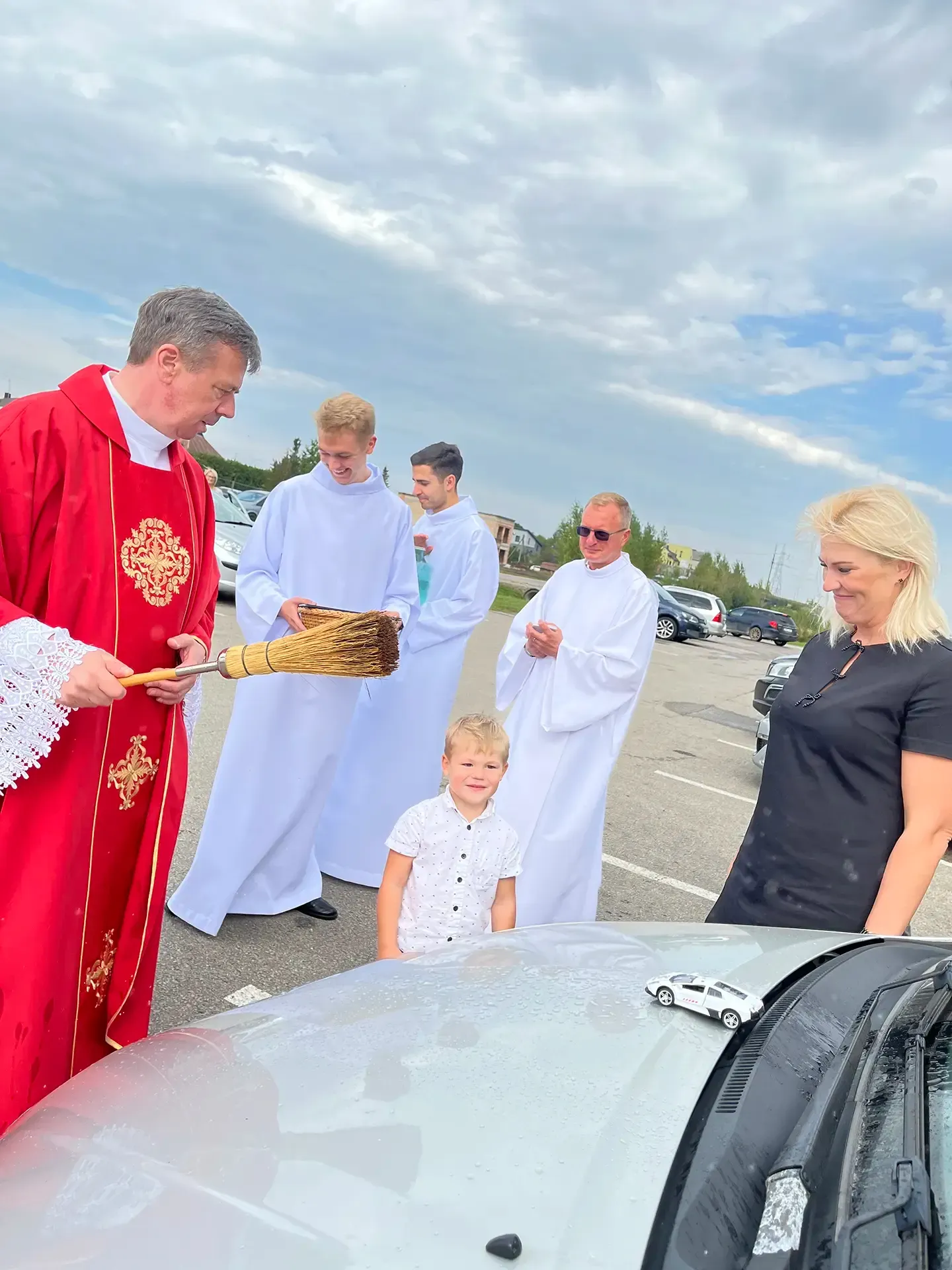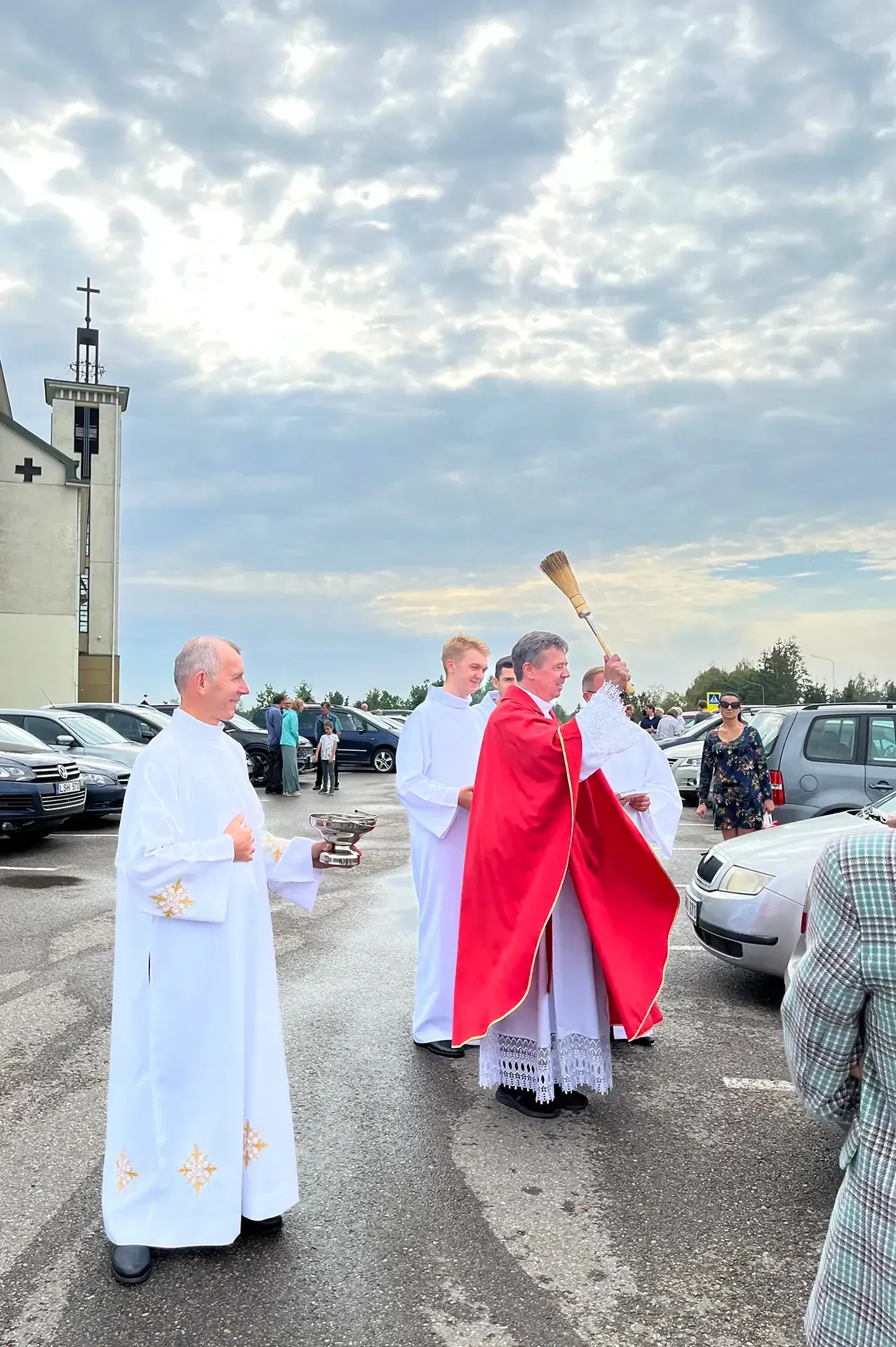 Vėliau dvasininkas aikštėje prie Domeikavos bažnyčios palaimino vairuotojus ir jų automobilius artėjančios Keliaujančiųjų ir vairuotojų dienos proga. Klebono pagalbininkai ministrantai žmonėms dovanojo atmintinę – Keliautojo maldą.