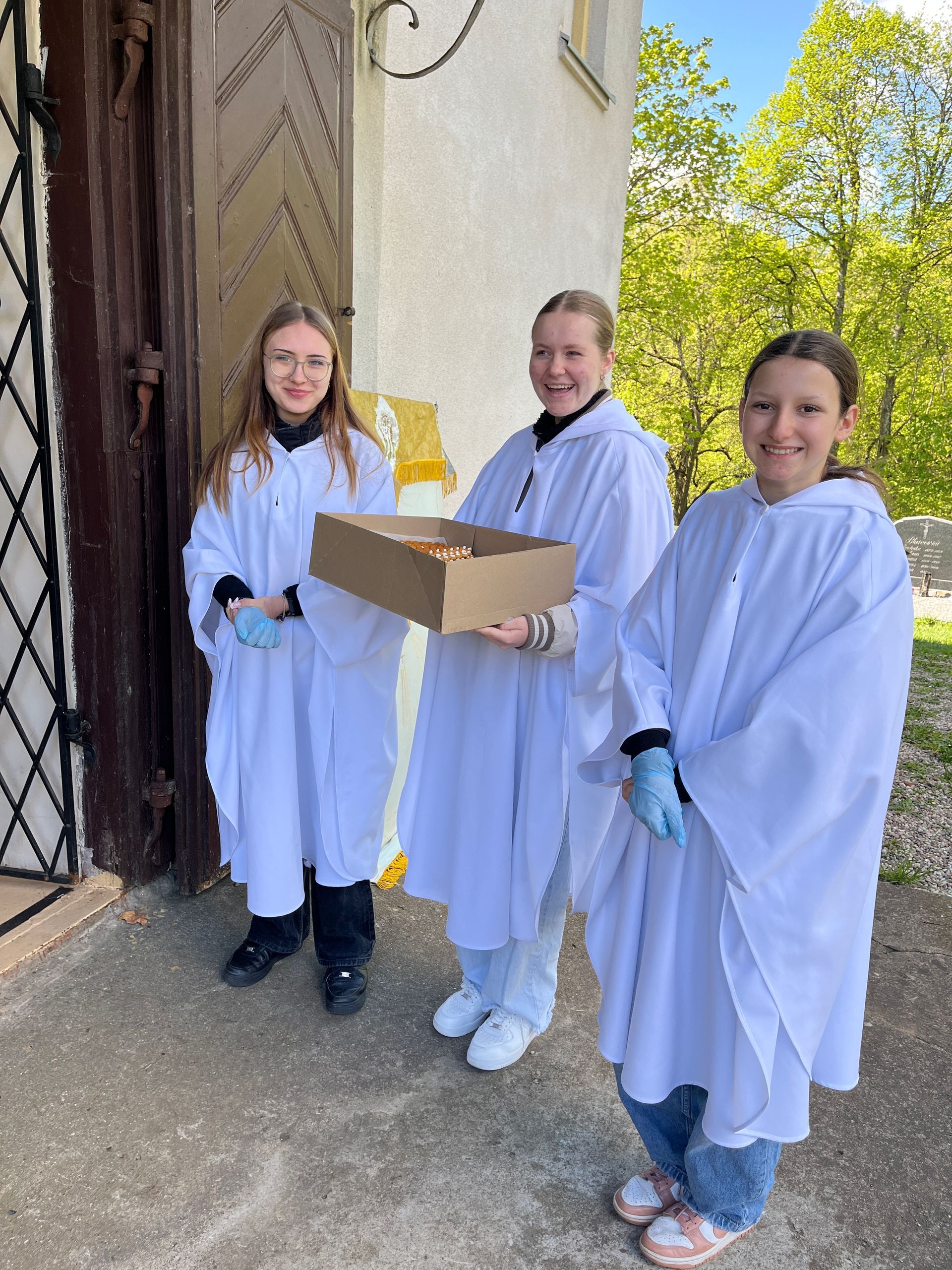 Vėliau parapijos jaunimas pamaldų dalyvius vaišino skanėstais bažnyčios šventoriuje.